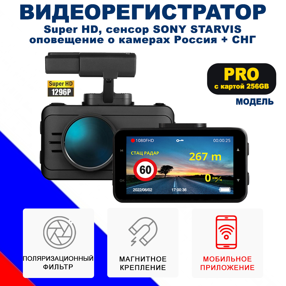 | Дополнительная информация | оповещение о камерах при помощи GPS-баз; управление и обновление при помощи смартфона; поляризационный CPL-фильтр |
