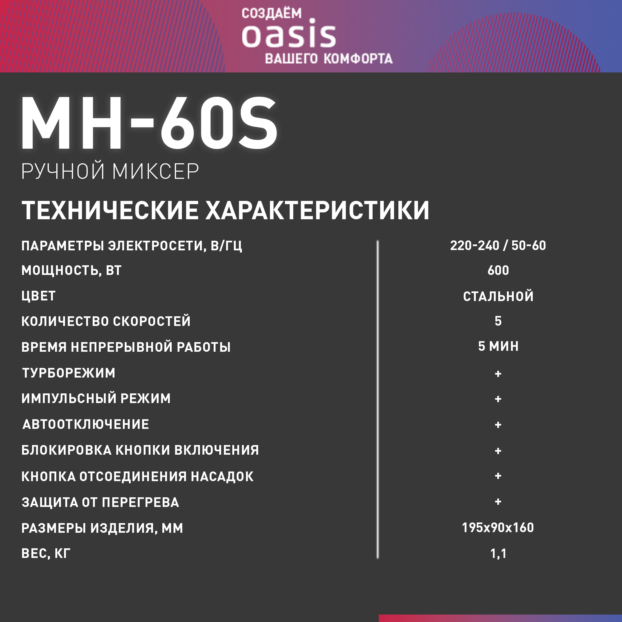 Ниже Вы можете прочитать отзывы на Миксер ручной OASIS MH-60S, ознакомится с подробными характеристиками, посмотреть интересные обзоры и фотографии на Миксер ручной OASIS MH-60S.