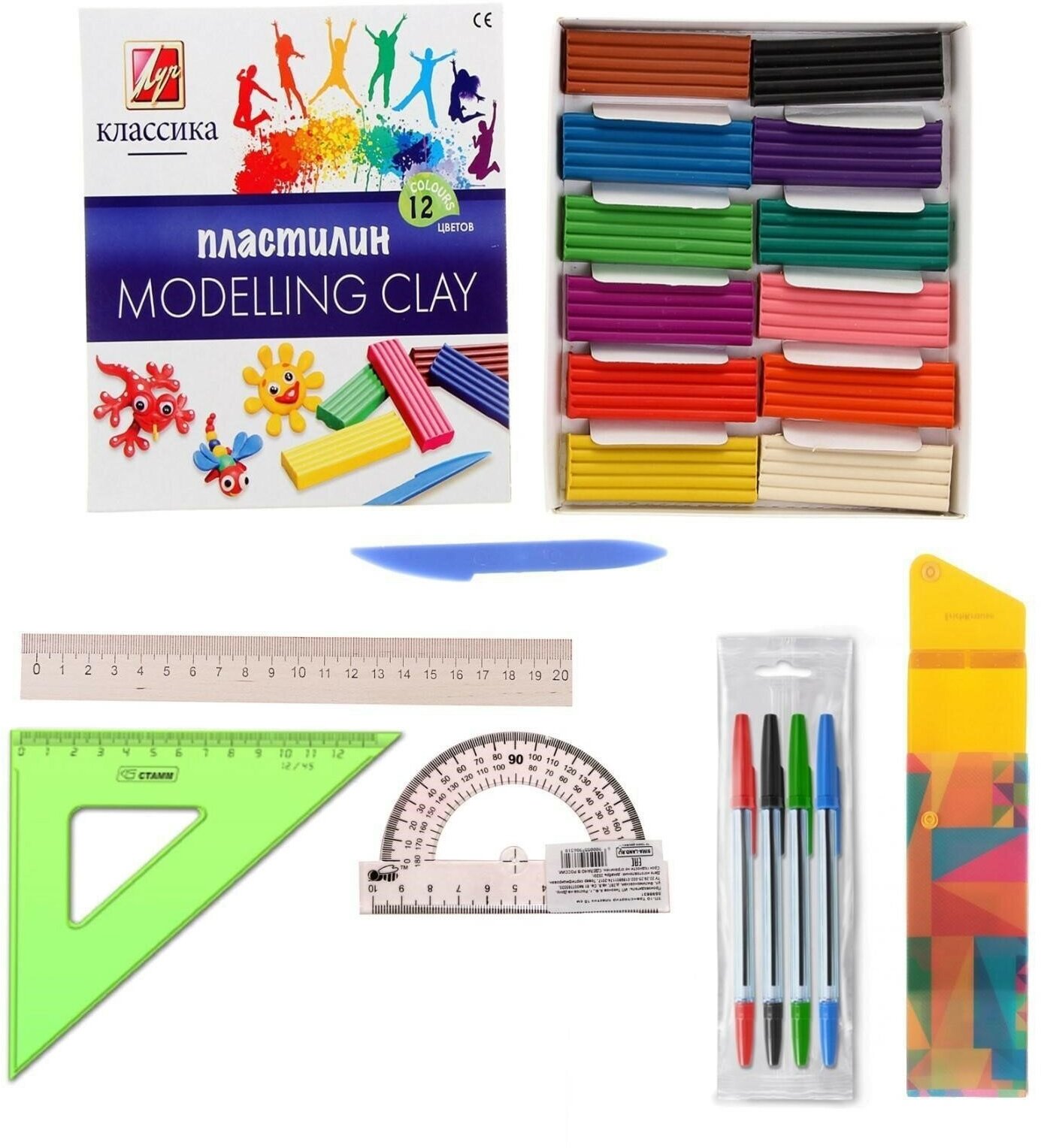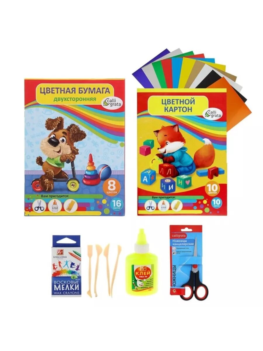 | В комплекте | альбом для рисования, блокнот, доска для лепки, карандаш, кисть, клей ПВА, клей-карандаш, ластик, линейка, ножницы, обложка, пенал, пластилин, ручка, счетные палочки, тетрадь, точилка, фломастеры, цветная бумага, цветной картон, цветные карандаши |
