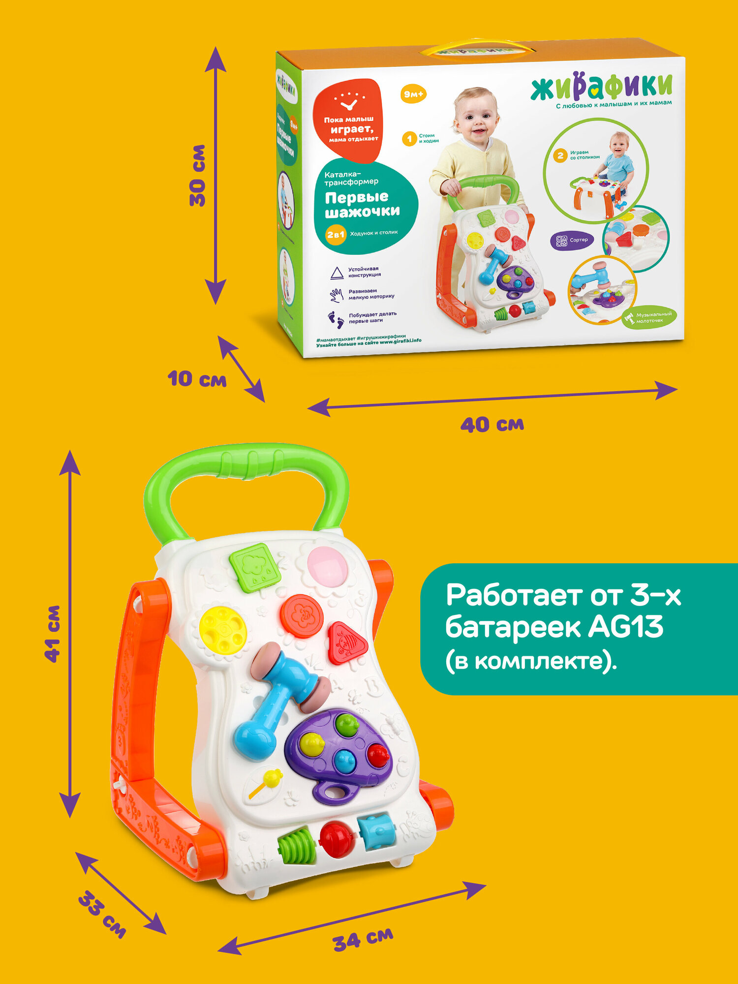 Каталка-ходунок "Первые шажочки" с муз. молоточком, 3AG13 включ.