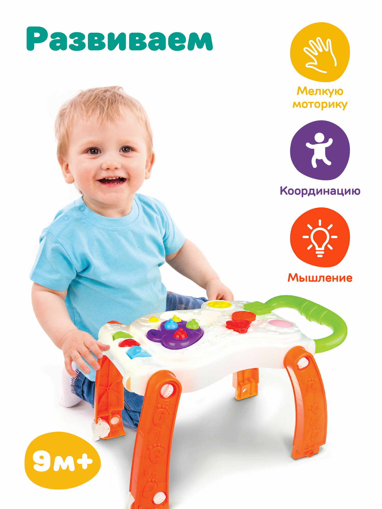 | Дополнительная информация | система блокировки колёс; на панели ходунков есть яркие вертушки, музыкальный молоток; при необходимости ходунок трансформируется в столик; молоточек работает от 3-х батареек типа AG13 |