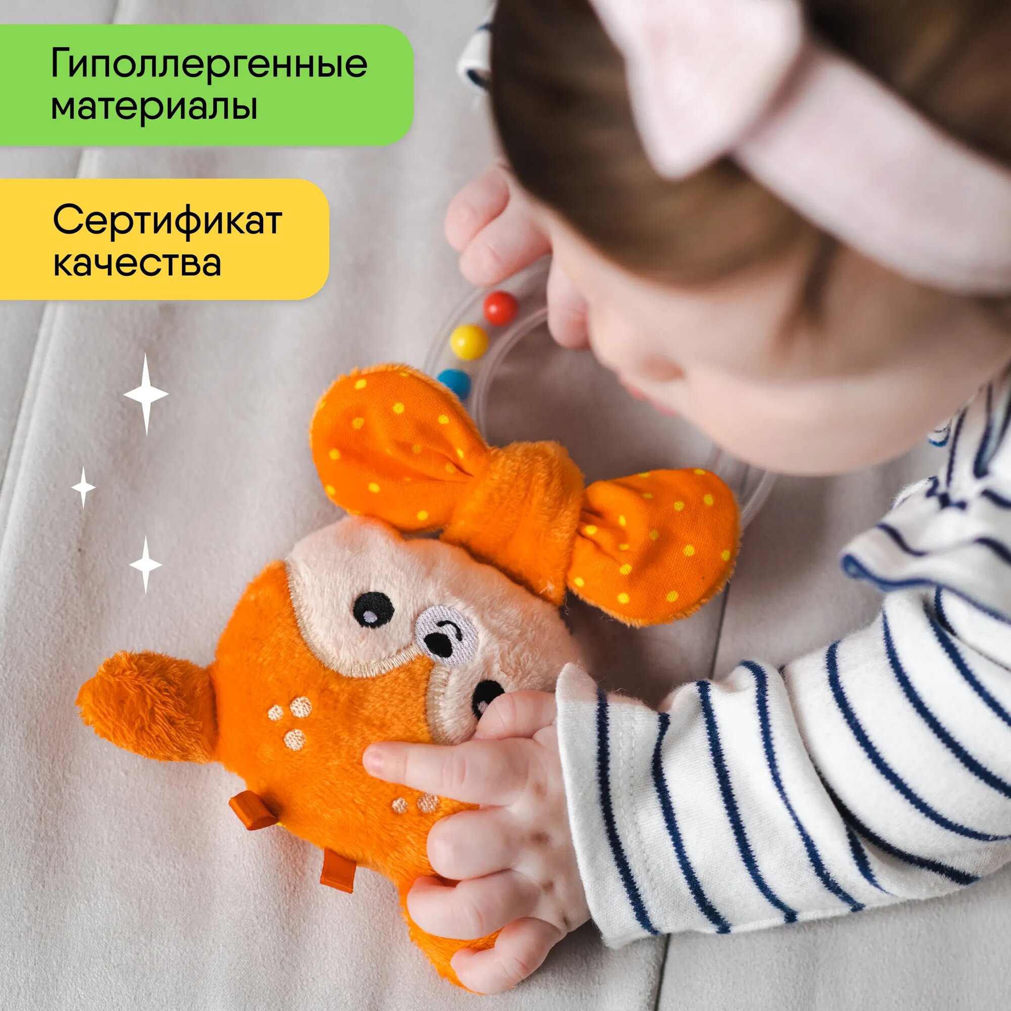 | Дополнительная информация | материал: пластмассовое колечко с разноцветными шариками, плюш, хлопок, синтепух |