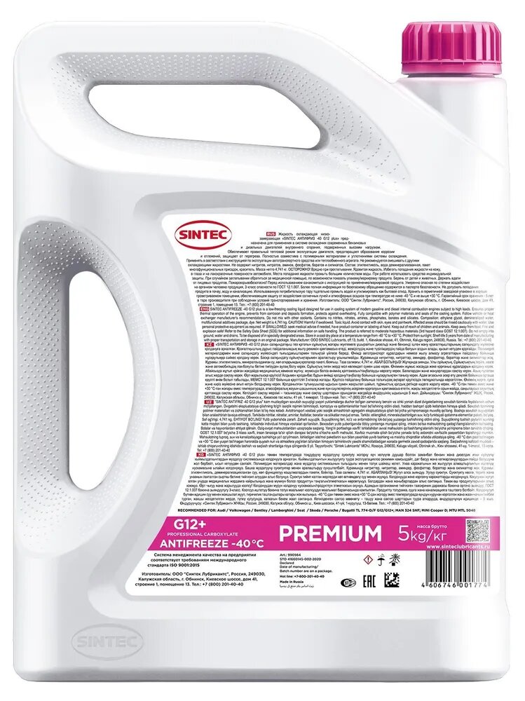 Антифриз Sintec Premium розовый G12+ (-40) 5 кг. SINTEC 990564 | цена за 1 шт