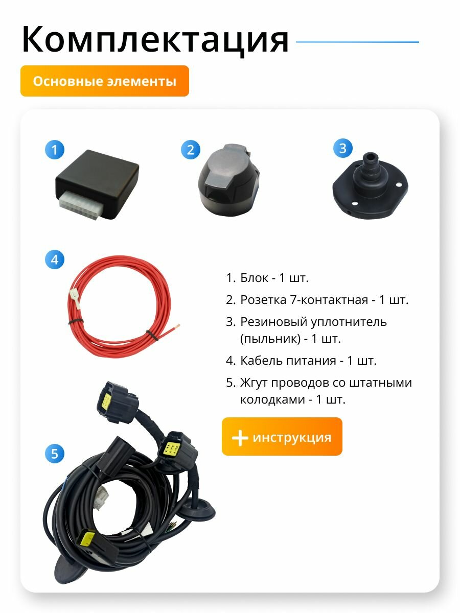 | Подробная комплектация | • Блок согласования -1шт. • Жгут проводов со штатными колодками. • Монтажный комплект -1шт. • Кабель питания-1шт. • Розетка 7-контактная с резиновым уплотнителем(пыльником)-1шт. • Инструкция -1шт. • Упаковочная коробка-1шт. |