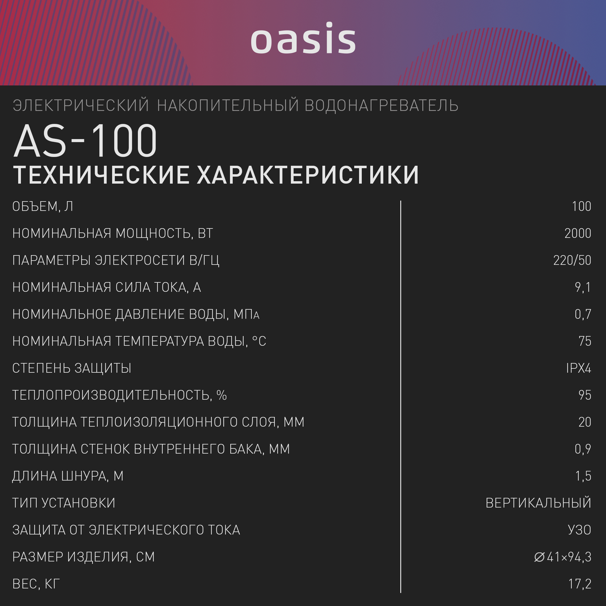 Водонагреватель накопительный электрический Oasis AS-100, бойлер для воды, 2000 Вт, 100 литров