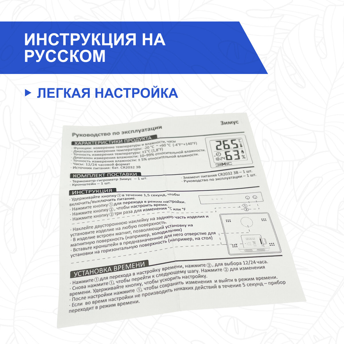 | Дополнительная информация | Комплектация: Термометр-гигрометр электронный ЗИМУС - 1 шт., кронштейн - 1 шт., липучка на стену - 1 шт., инструкция - 1 шт., батарейка CR2032 - 1 шт. |