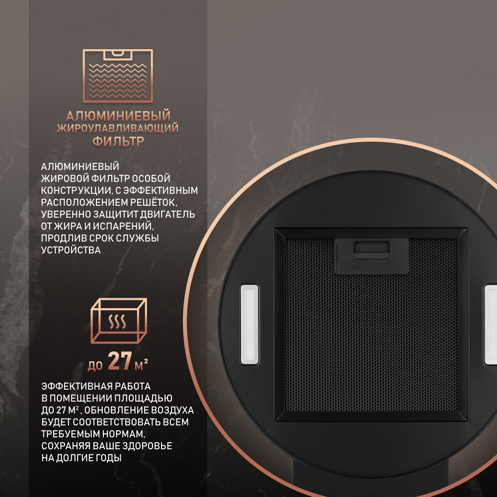 | Дополнительная информация | Эффективная работа в помещении площадью до 27 м2, Низкий уровень шума 42 дБ, Надежный электронный блок управления, Интегрированное освещение, Возможность установки угольного фильтра |