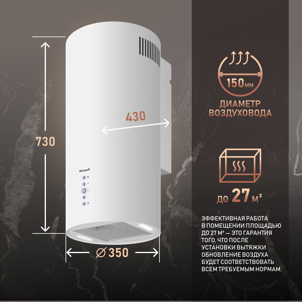 Вытяжка цилиндрическая пристенная Weissgauff Gracia 70 WH 3 года гарантии, Алюминиевый жировой фильтр, Низкий уровень шума