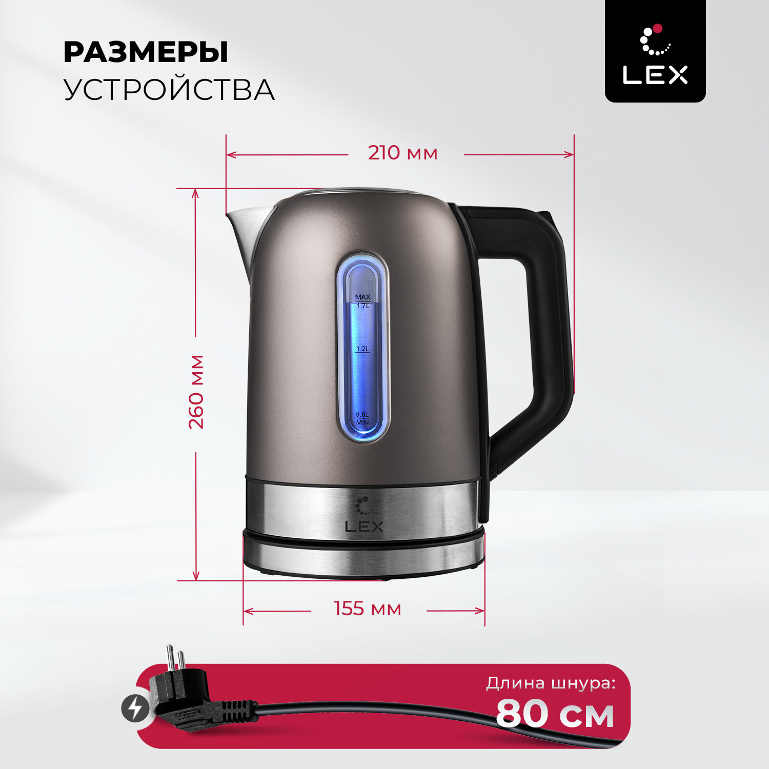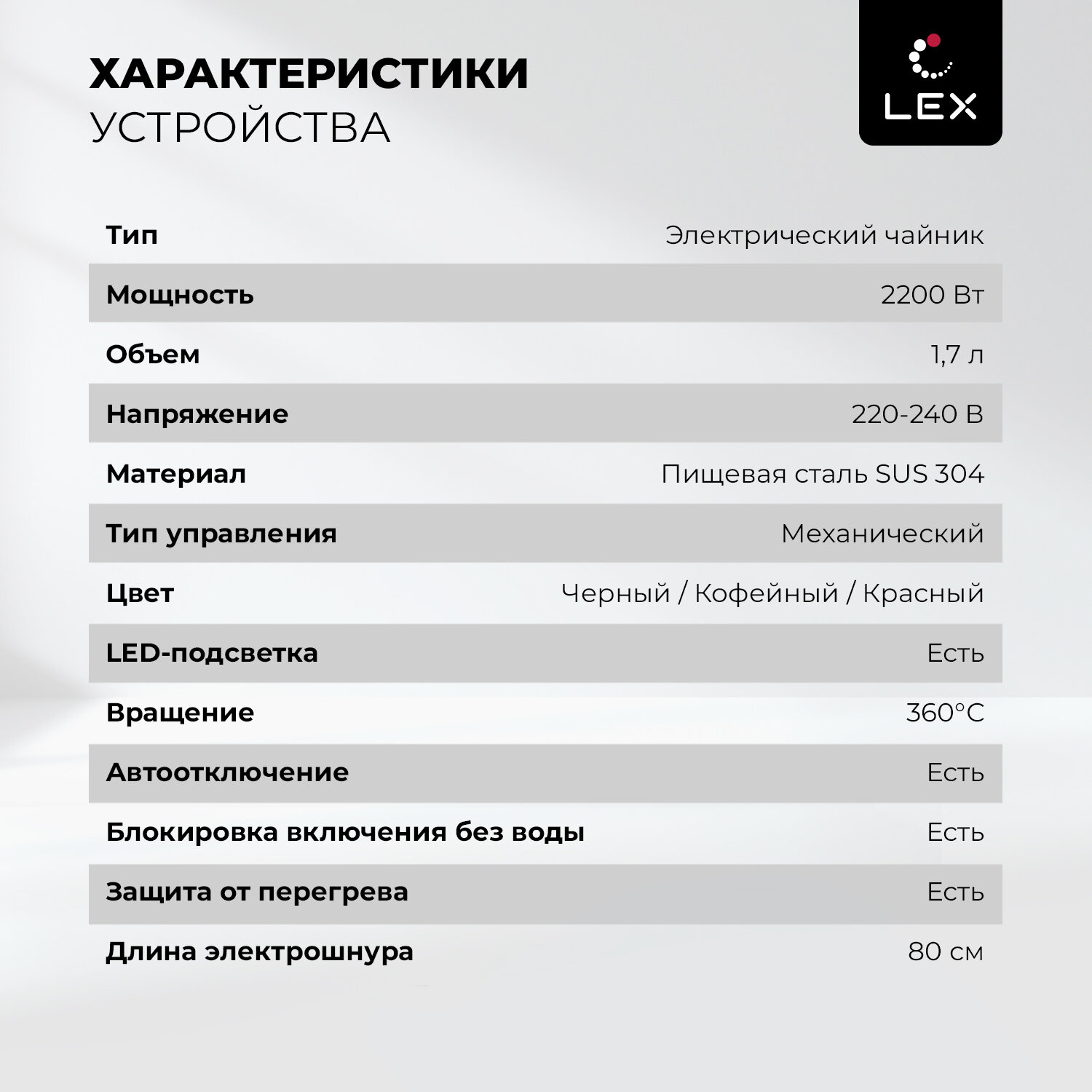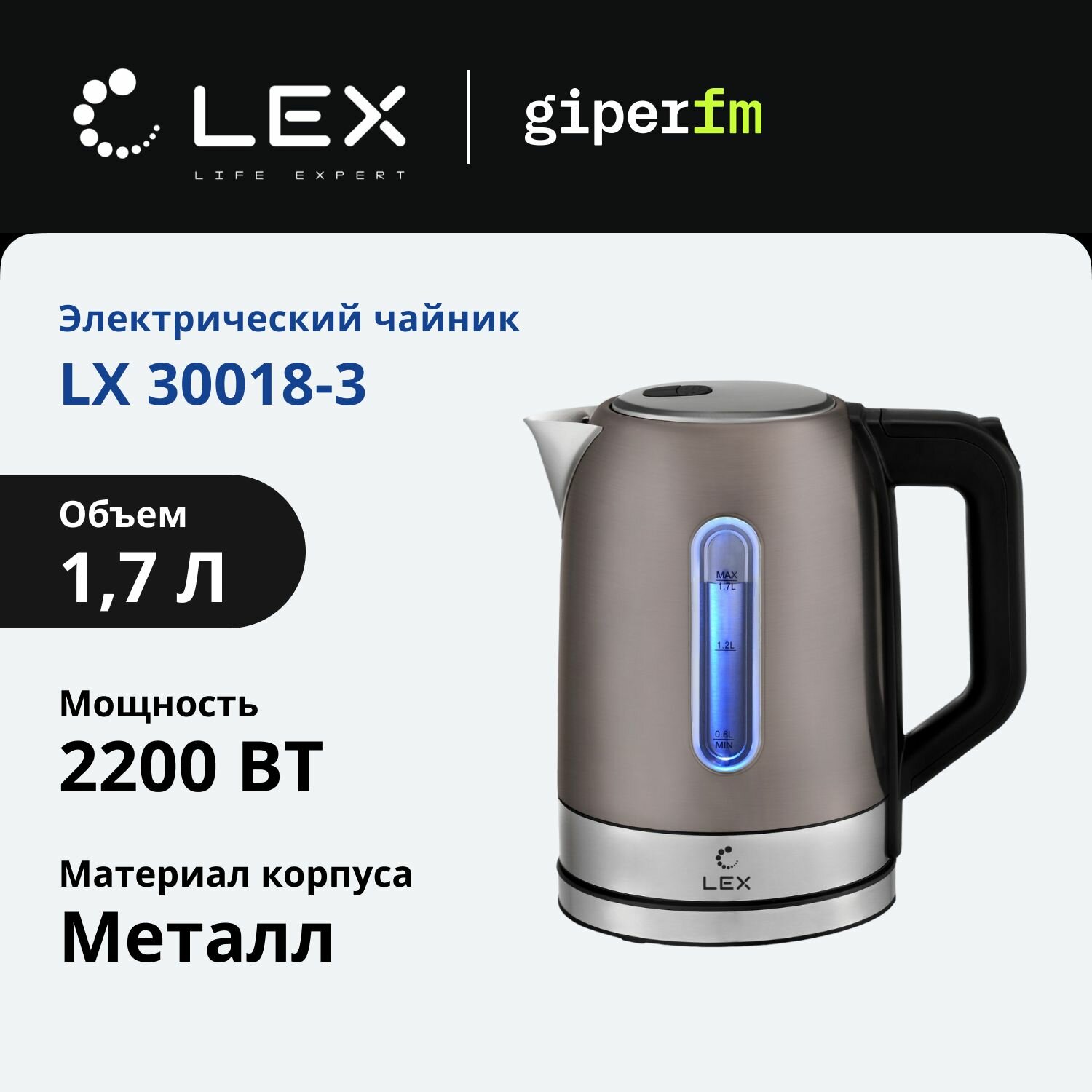 СохранитьЧайник электрический с подсветкой LEX LX 30018-3, пищевая сталь SUS304, плавное открывание крышки, блокировка включения без воды, защита от перегрева. интересное: