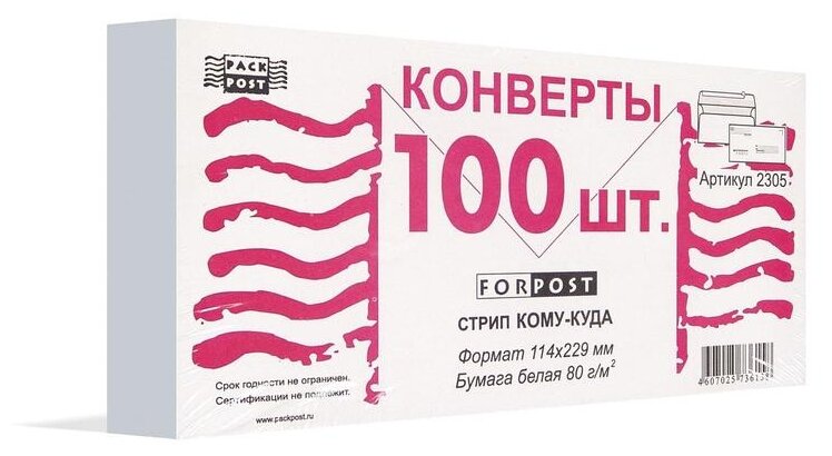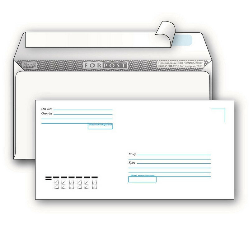 Конверт почтовый E65 Packpost ForPost (110x220мм, 80г, отрывная лента, печать "Куда-Кому") 100шт, 12 уп.