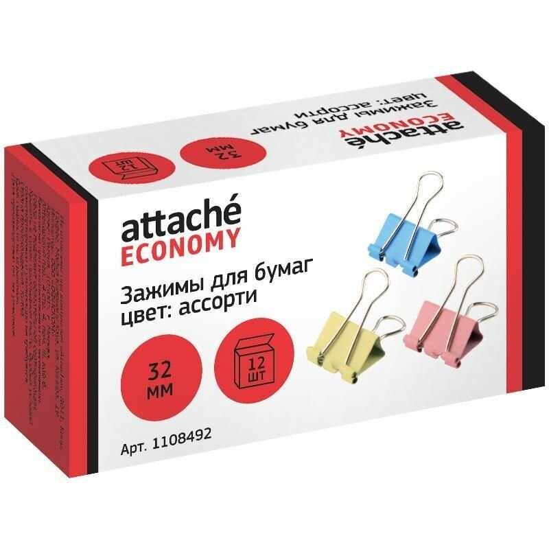 Attache Economy Зажимы для бумаг Цветные, 32 мм 12 шт, 12 уп