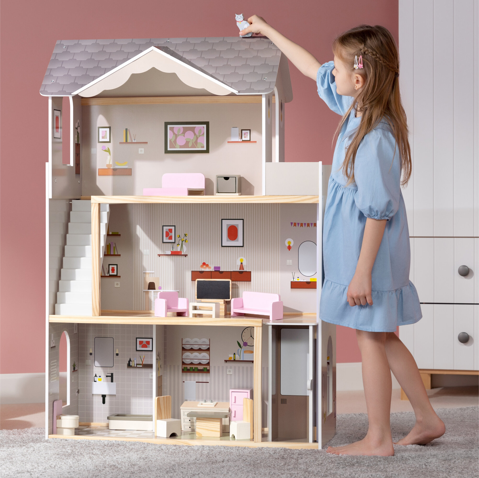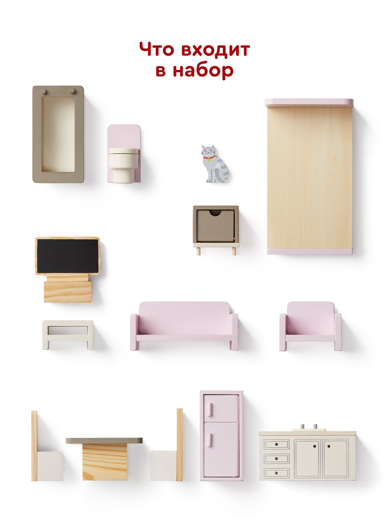| Подробная комплектация | дом с балконом и лифтом, 13 предметов мебели, деревянная фигурка кошки |