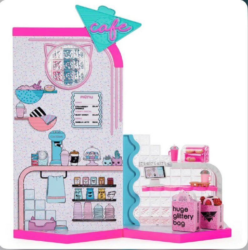 | Подробная комплектация | Двухэтажный бутик Кафе с двусторонней стойкой и зоной отдыха более 50 сюрпризов - обувь, одежда, аксессуары для кукол LOL, продукты питания и многое другое |