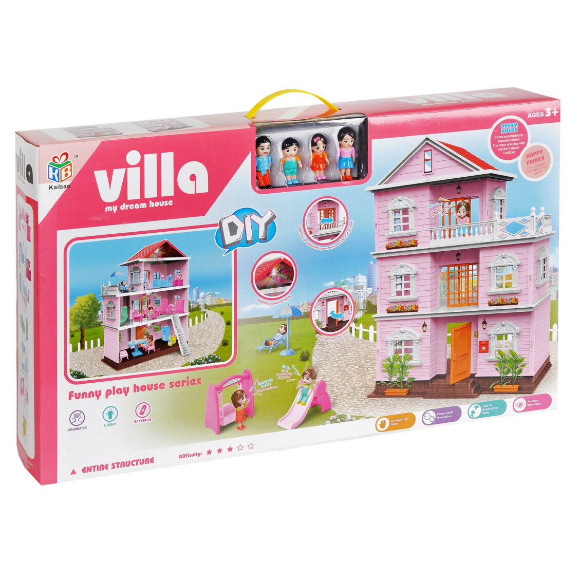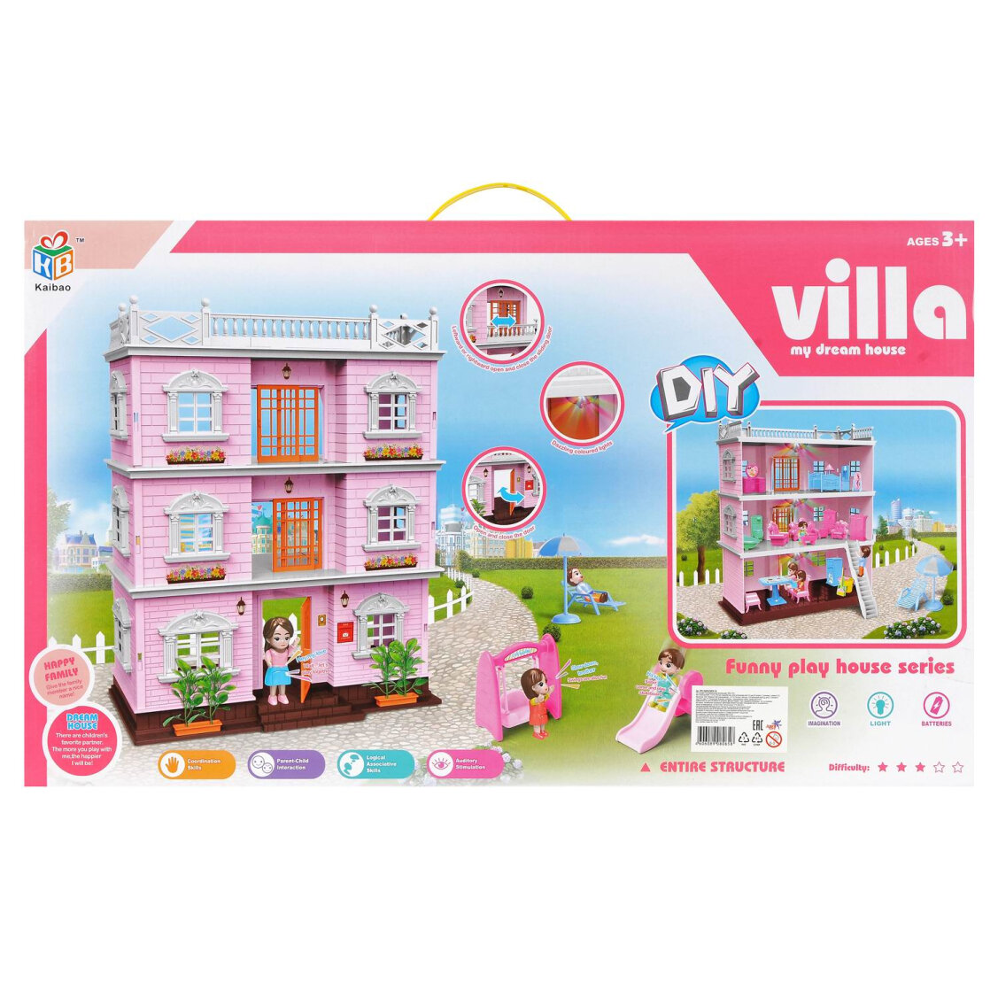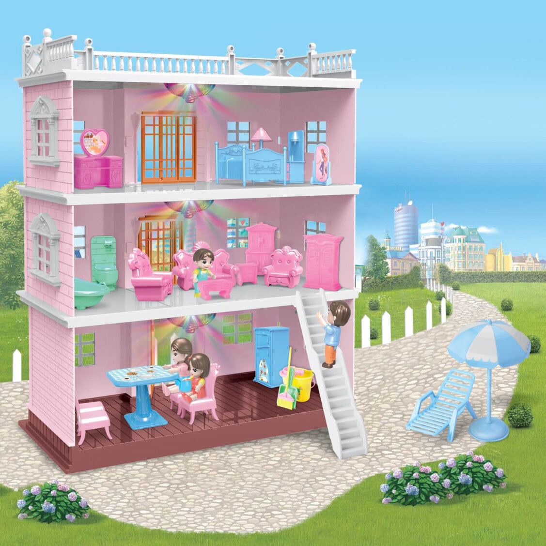 Дом для кукол Junfa трехэтажный, с мебелью, 4 фигурками, сборный, свет (WK-C8890)