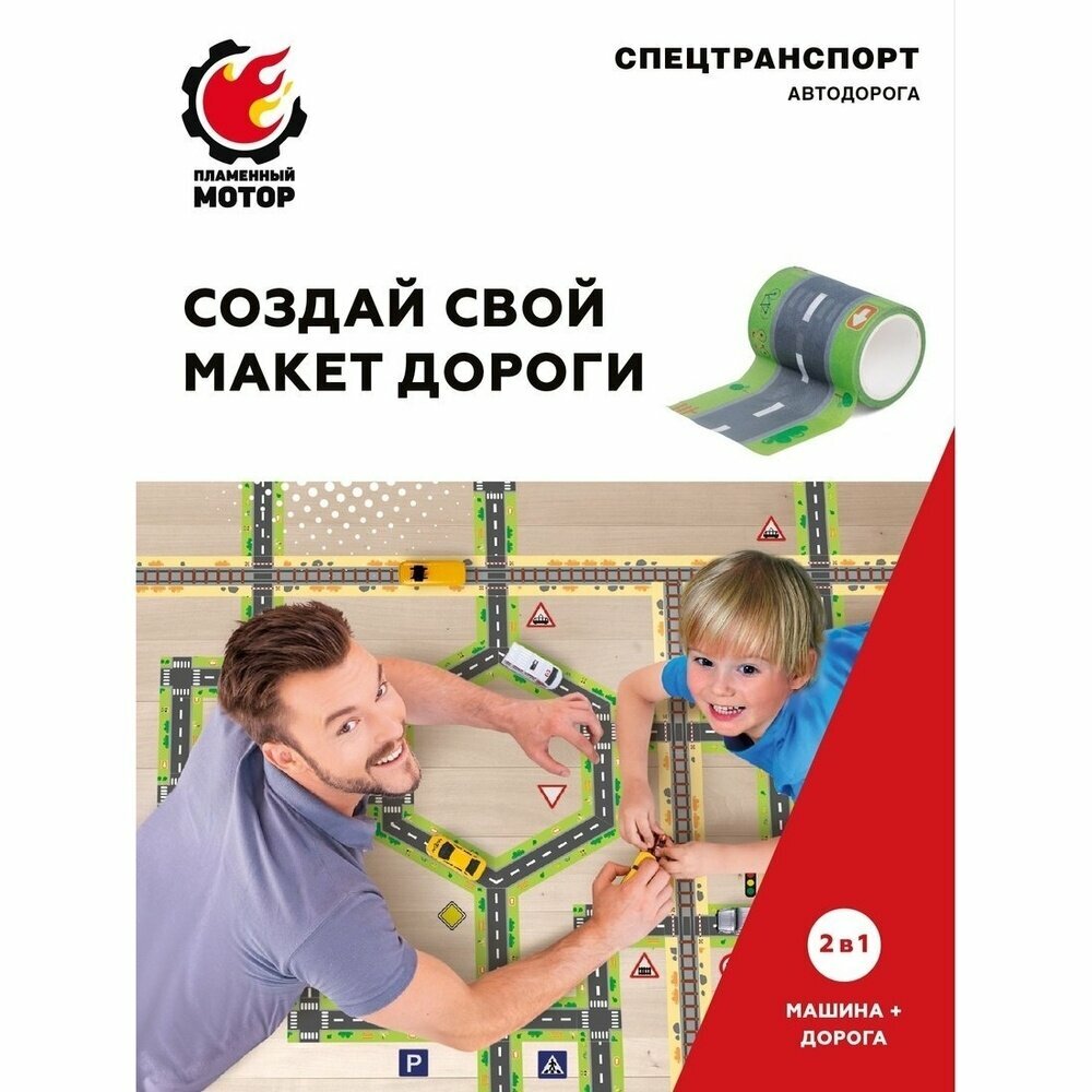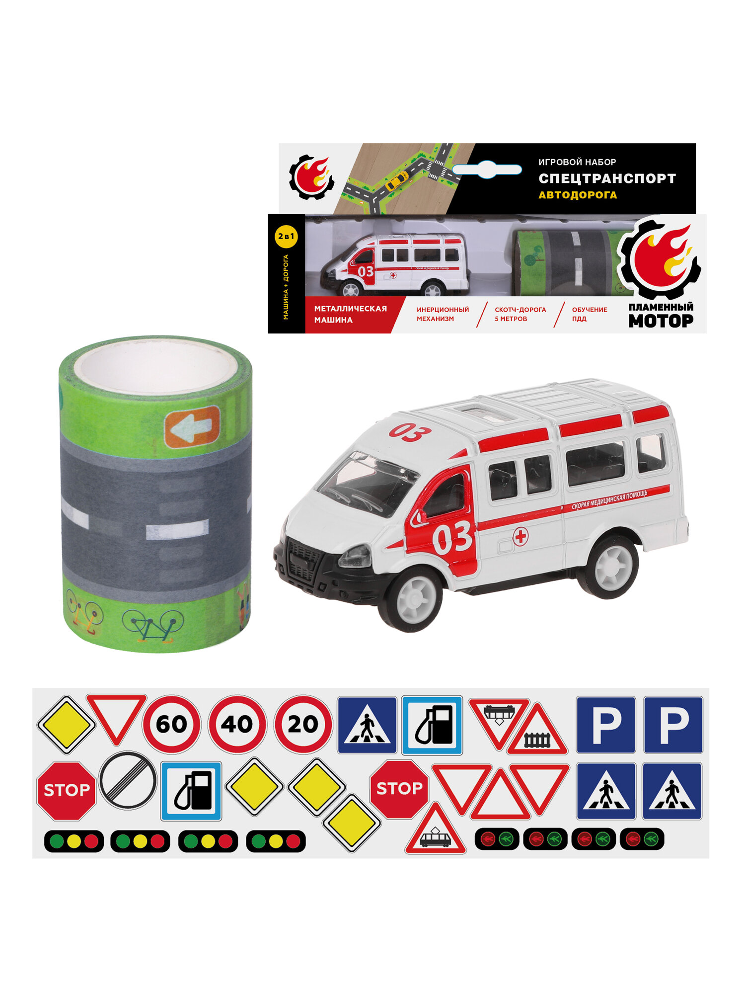 Набор Спецтранспорт Автодорога, машина Скорая помощь инерционная, скотч-дорога 5м, наклеки с дорожными знаками Пламенный мотор 870667