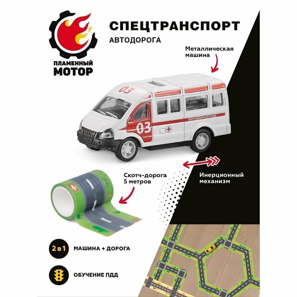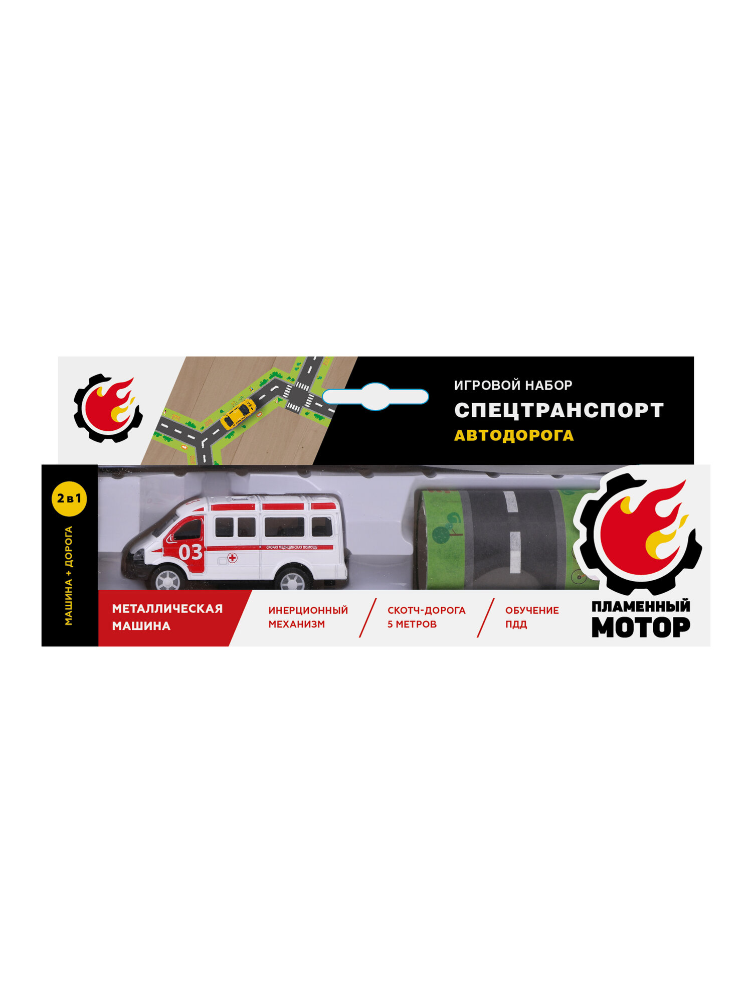 Купить Набор Спецтранспорт Автодорога Пламенный мотор: металлическая машинка "Скорая помощь" и скотч-дорога