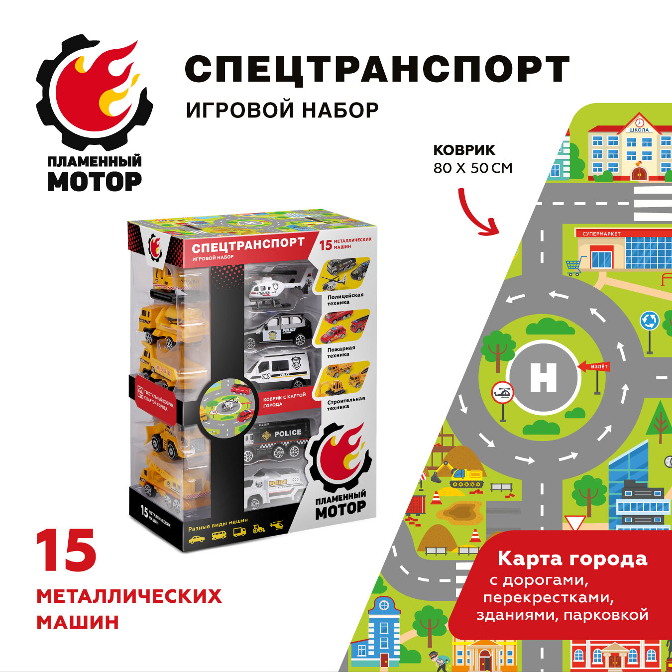 Купить Набор металлических машинок Спецтранспорт 15 шт, коврик с картой города и дорогами, знаки ДД