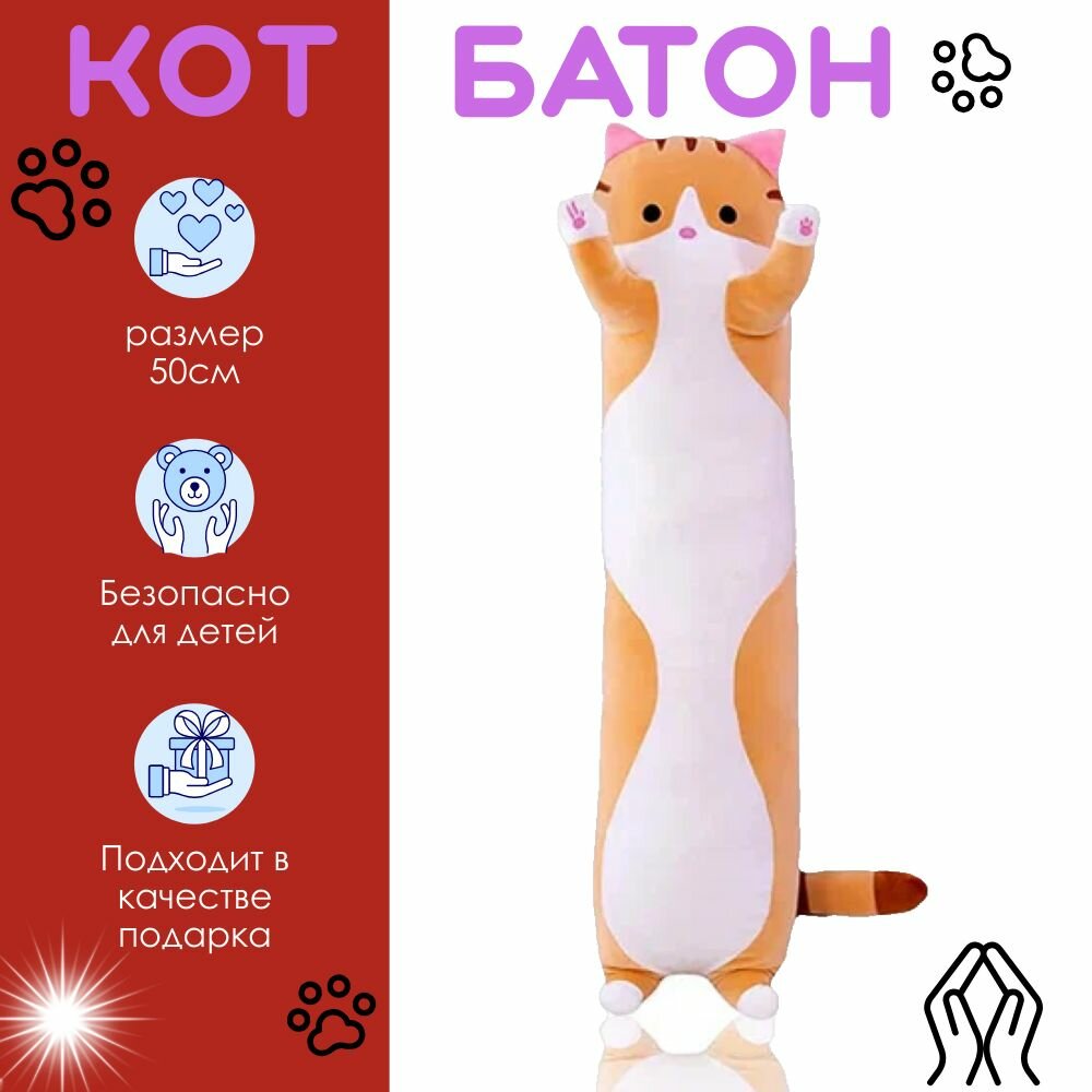 Мягкая плюшевая игрушка подушка антистресс Кот Батон для взрослых и детей на подарок 50см