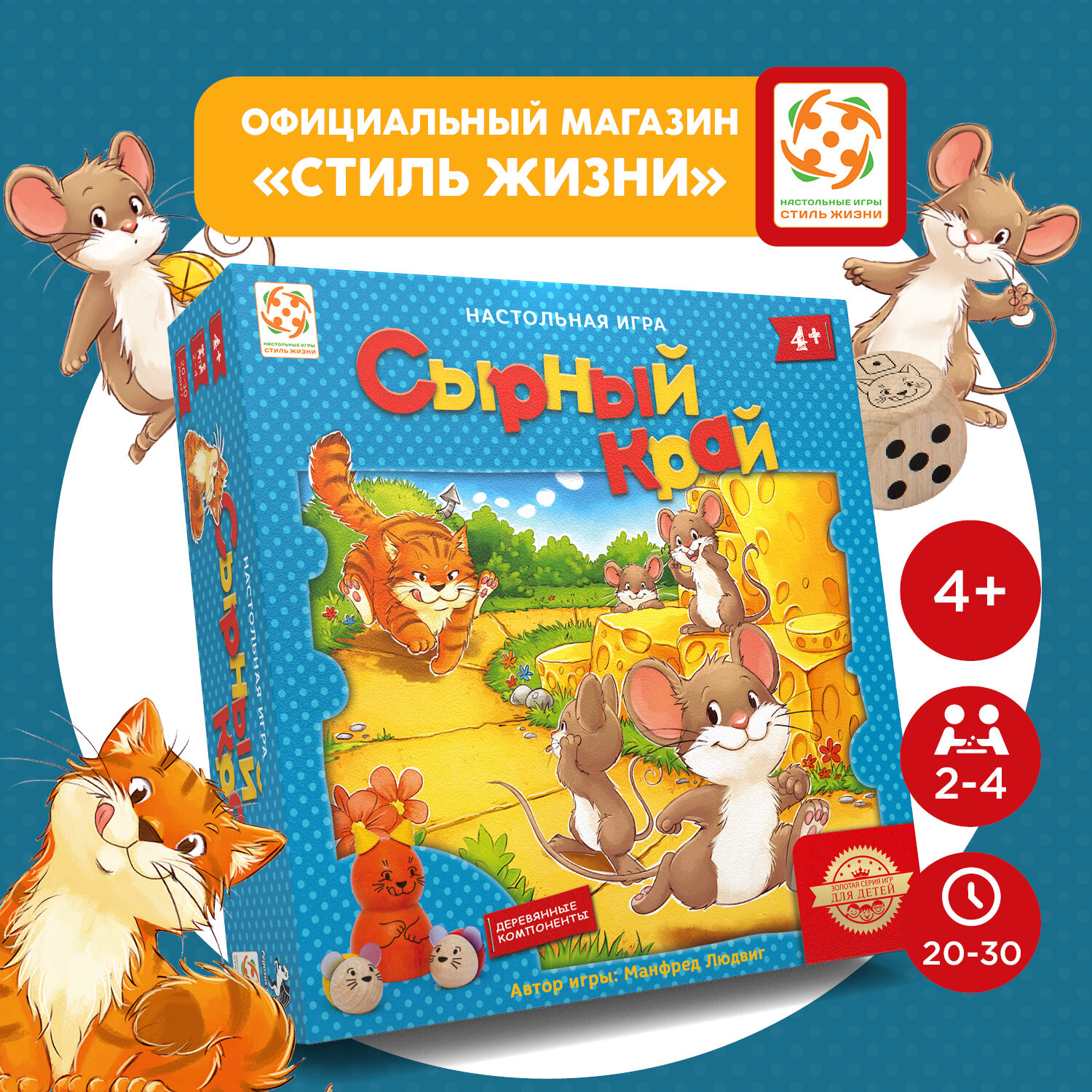 | Комплектация | - игровое поле; - фигурка кошки; - 18 мышат 4 цветов; - 20 кусочков сыра; - деревянный кубик; - правила игры |