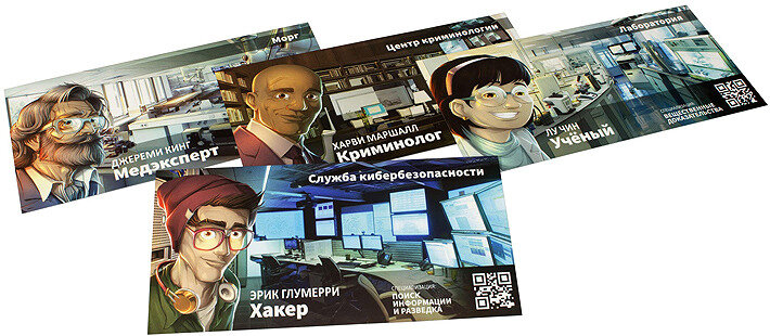 | Комплектация | 55 карт персонажей, 52 карты улик и особых предметов, 4 планшета экспертов, 17 планшетов районов, поле для улик, правила игры |
