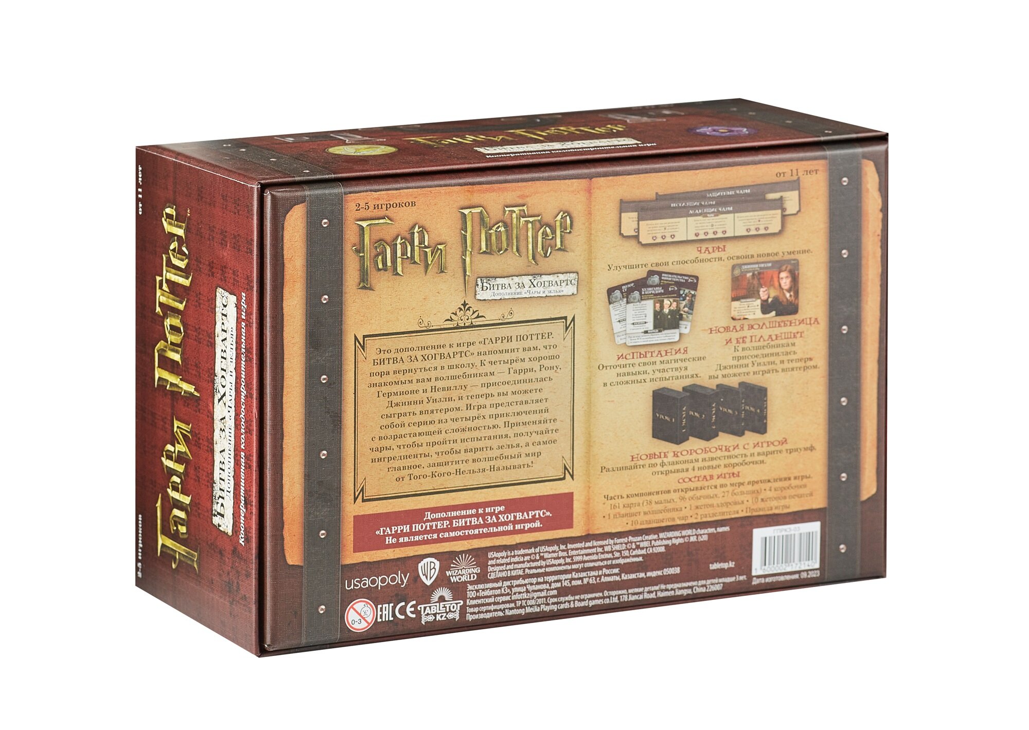 | Дополнительная информация | В начале игры каждый участник выбирает себе одного из персонажей, за которого он будет играть: Гарри, Гермиона, Рон или Невилл. В течение игры герои будут противостоять темным силам, отражая атаки приспешников Темного Лорда. У каждого персонажа в стартовой колоде помимо семи стандартных заклинаний есть три уникальных карты, поэтому стили игры участников могут несколько отличаться. Всего в наборе семь коробок с картами и правилами, по числу книг Д. Роулинг. Коробки открываются по ходу игры, следуя сюжету книг. Каждый новый набор вводит новые карты, заклинания, полезные артефакты, союзников, карты героев заменяются на карты с ними же, но уже повзрослевшими, раскрывая дополнительные возможности. Но самое главное – каждый раз появляются все новые злодеи с особыми свойствами. Таким образом, сложность и длительность партий будет увеличиваться с каждой новой коробкой. |
