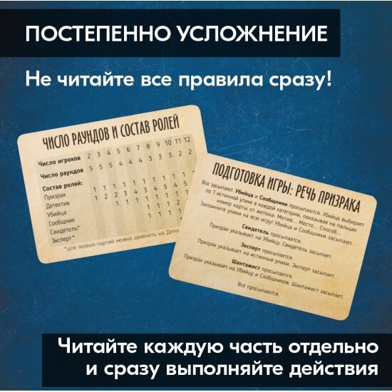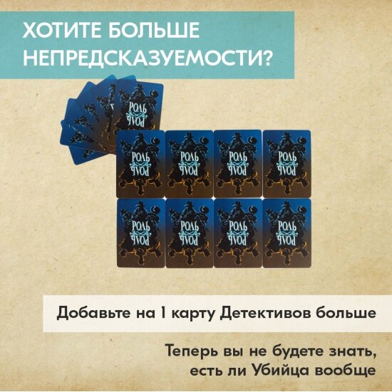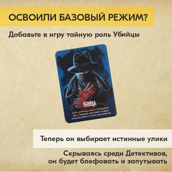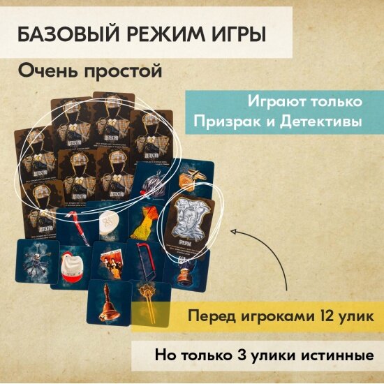 | Комплектация | 150 карт улик, 14 карт тайных ролей, 12 карт персонажей (двусторонние), 3 жетона категорий, 1 жетон рации, 1 жетон почтового ящика, карта-памятка, правила игры |