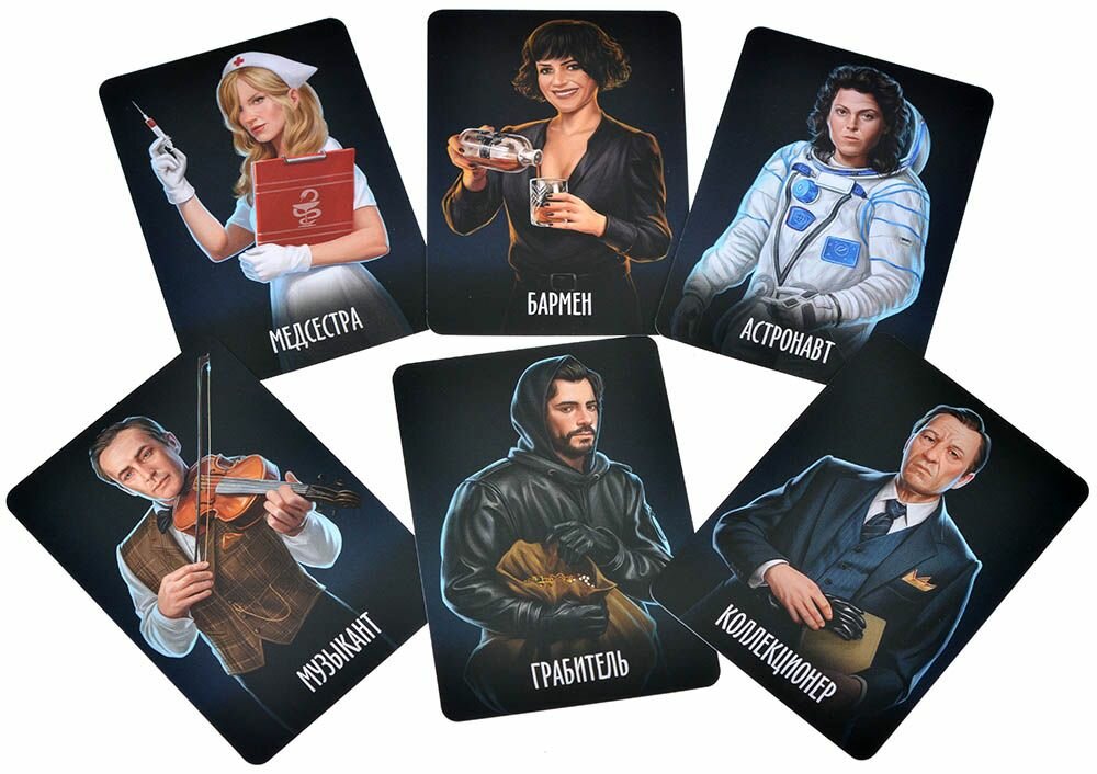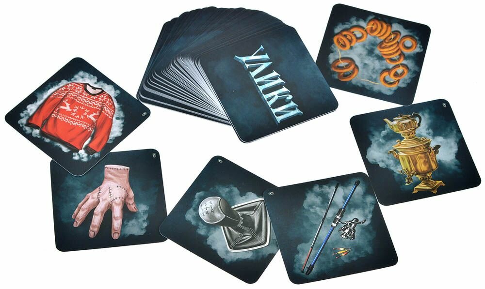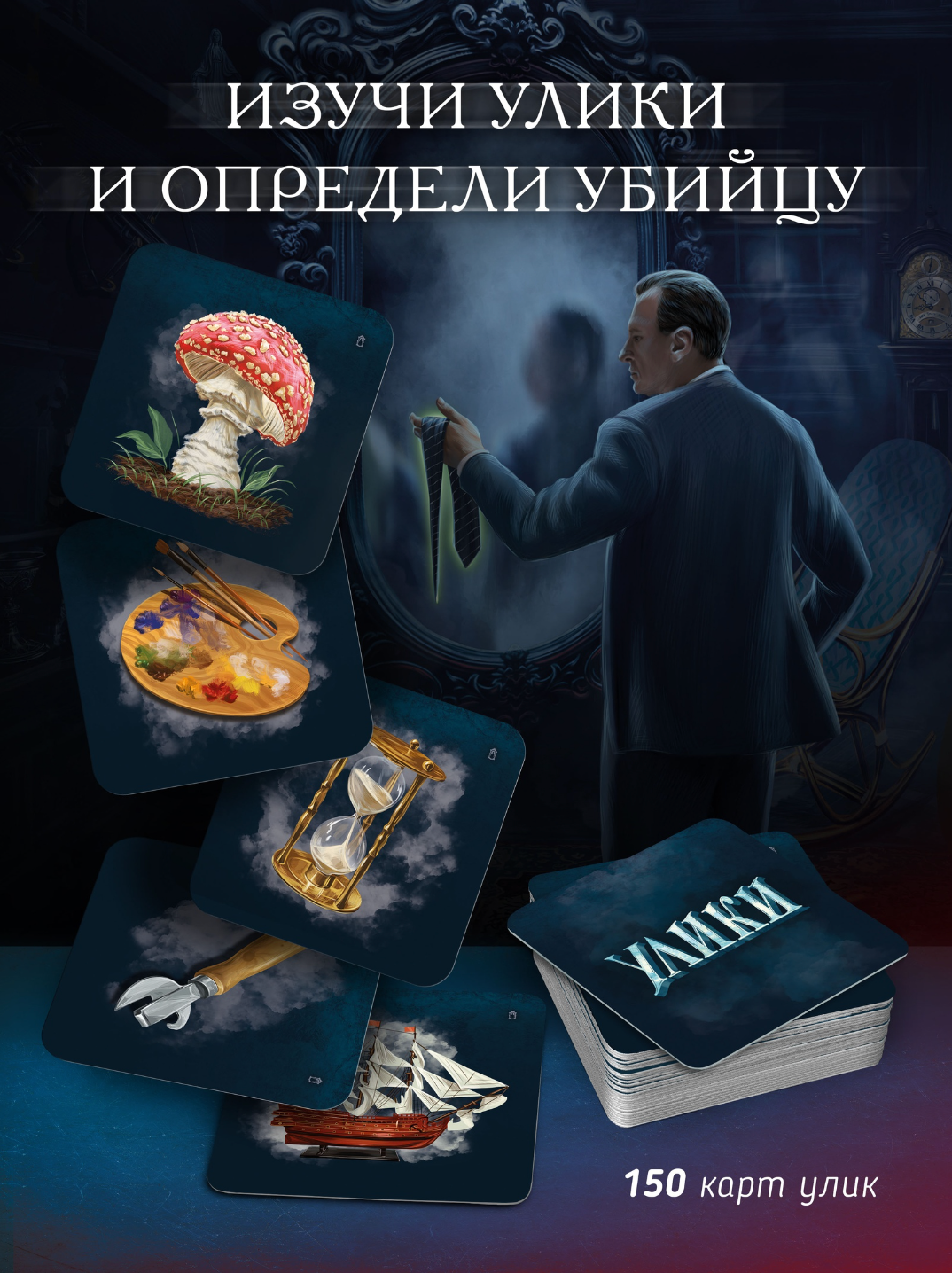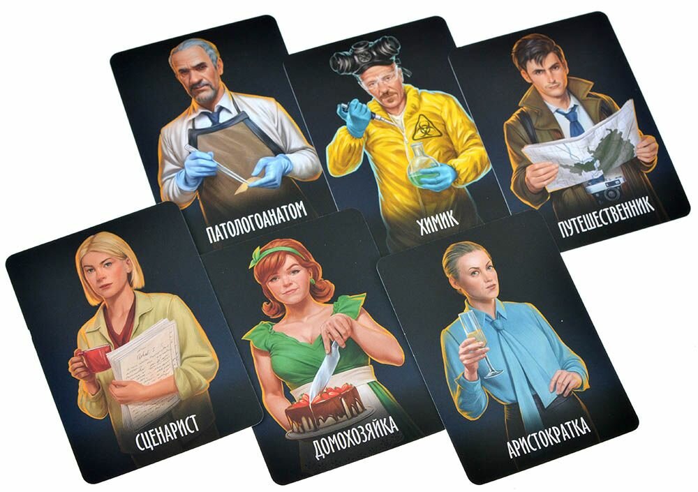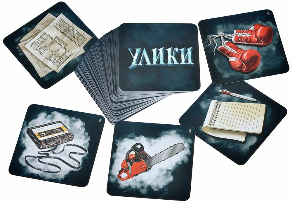 | Комплектация | 150 карт улик, 14 карт тайных ролей, 12 карт персонажей (двусторонние), 3 жетона категорий, 1 жетон рации, 1 жетон почтового ящика, карта-памятка, правила игры |