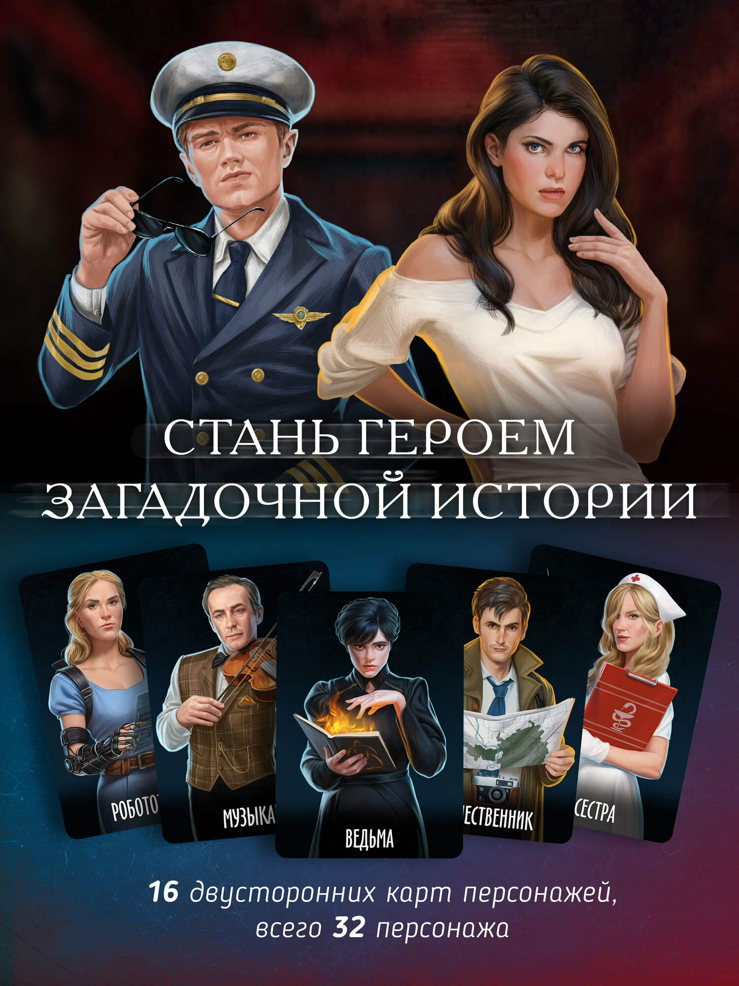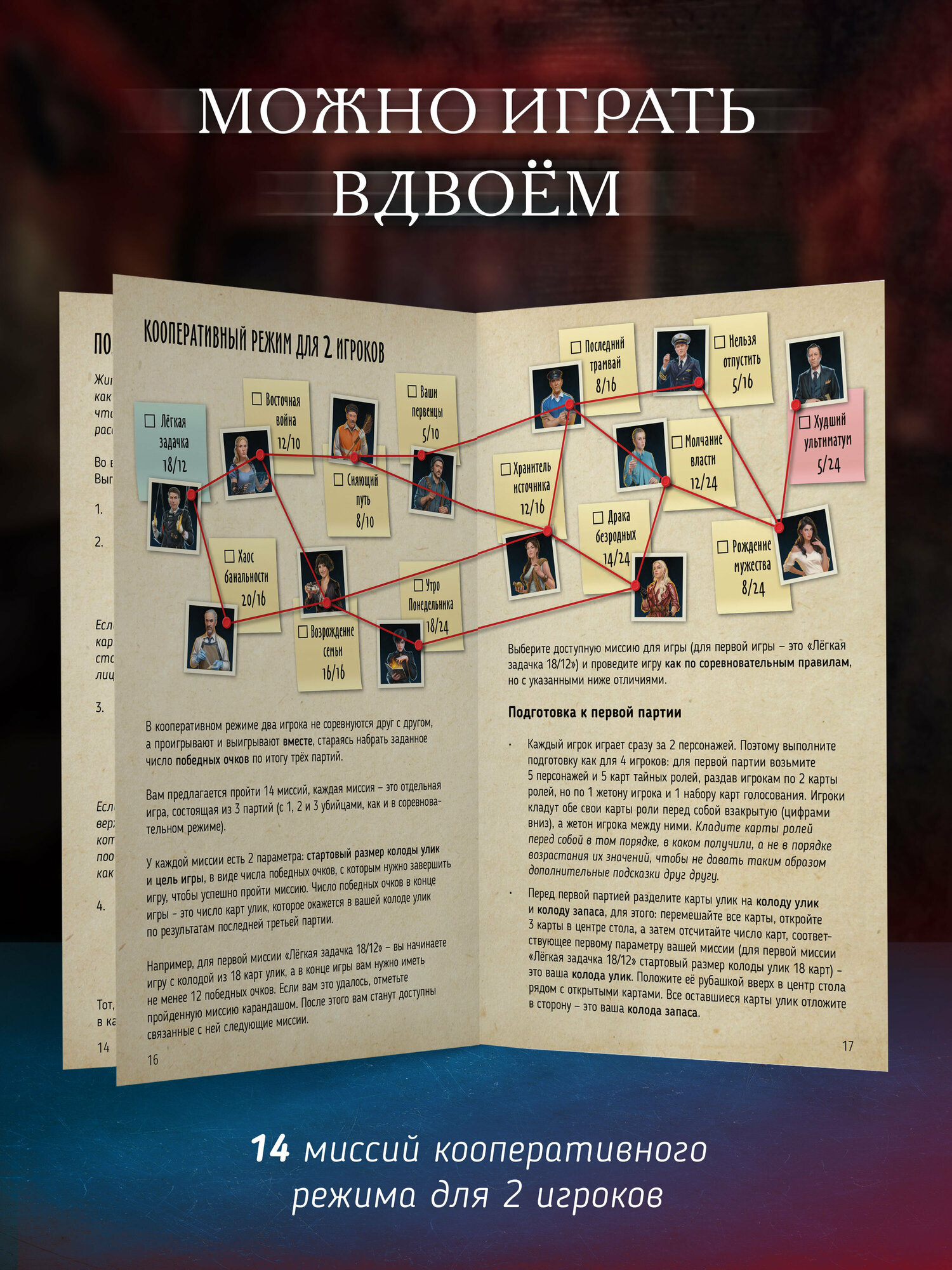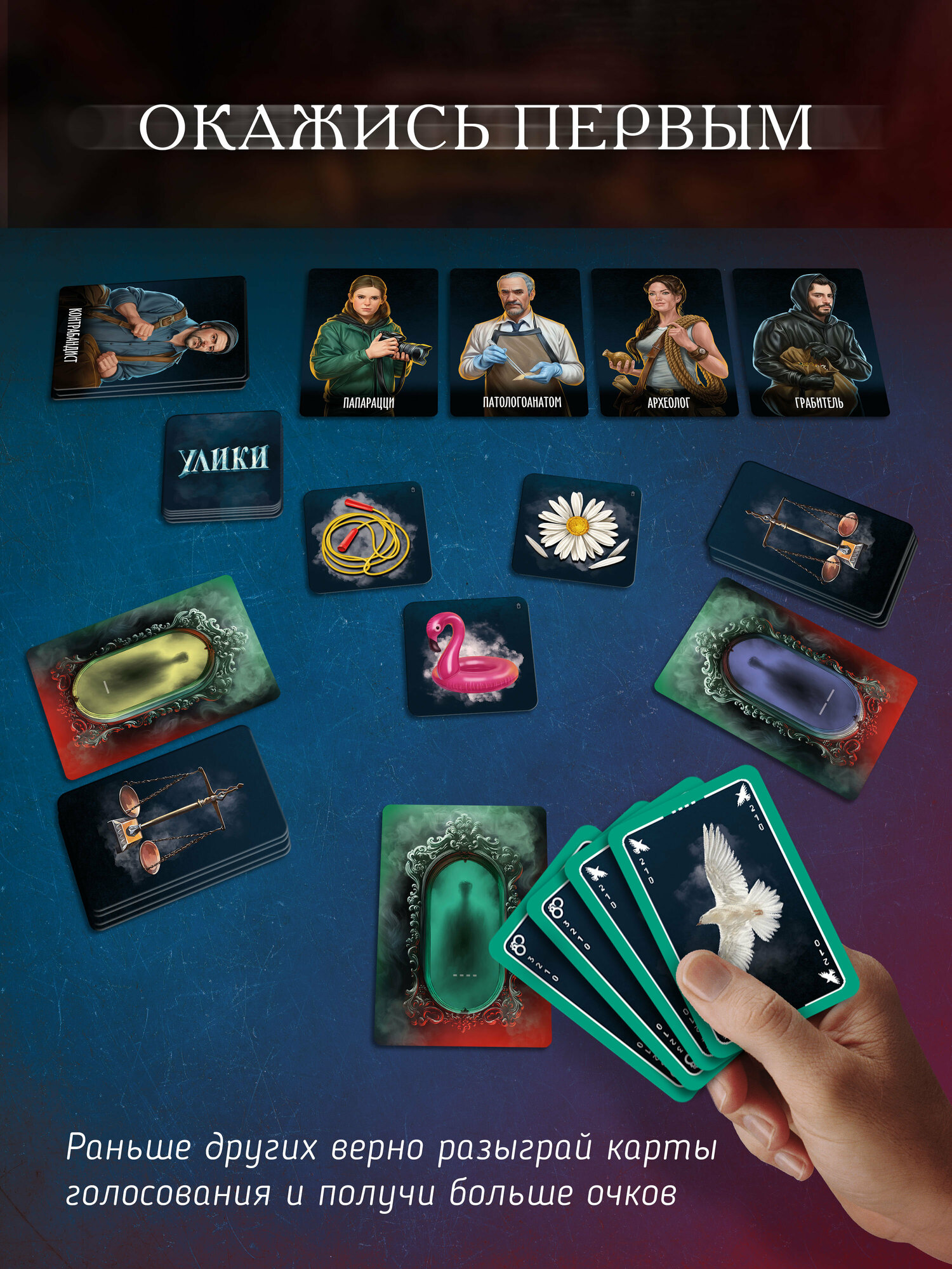 | Комплектация | 150 карт улик, 14 карт тайных ролей, 12 карт персонажей (двусторонние), 3 жетона категорий, 1 жетон рации, 1 жетон почтового ящика, карта-памятка, правила игры |