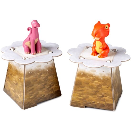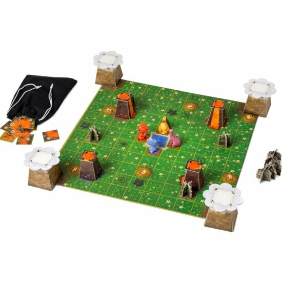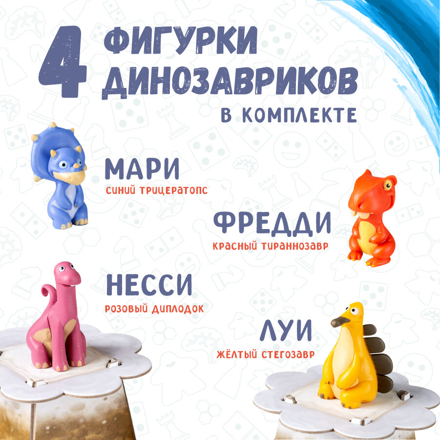 | Комплектация | 4 фигурки динозавриков, 1 игровое поле, 4 фигурки вулканов, 4 фигурки гор, 4 фигурки острых скал, 5 фигурок колючих кустов, 58 квадратов опасности, 6 яиц динозавров, 1 большой тканевый мешок, 1 книга правил |