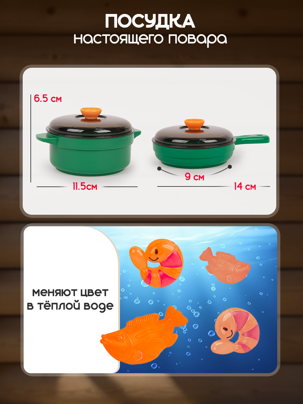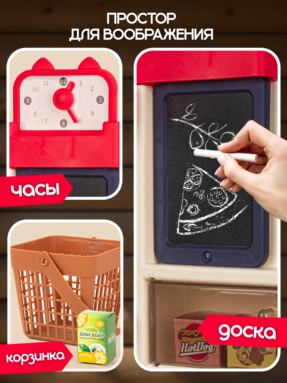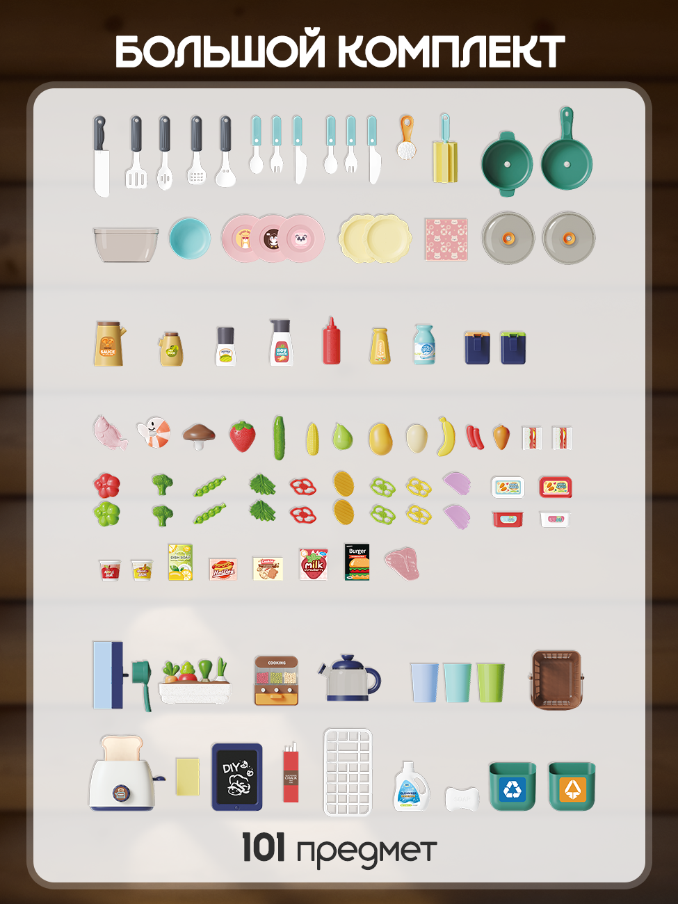 | Комплектация | сковорода / кастрюля / крышка / столовые приборы / тарелки и салатница / чайный сервиз / бутылочки и баночки для специй и приправ. Набор продуктов - конфеты и печенье / яички / готовые блюда (сосиски и яичница) / обычные овощи и фрукты / разрезные продукты. Яйцеварка / разделочная доска / меловая доска / губка и мелки / контейнеры для фруктов и овощей |