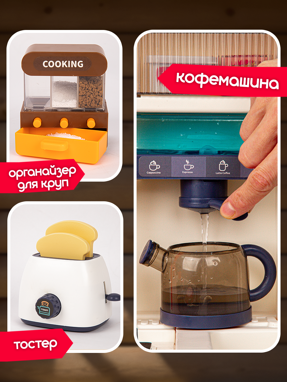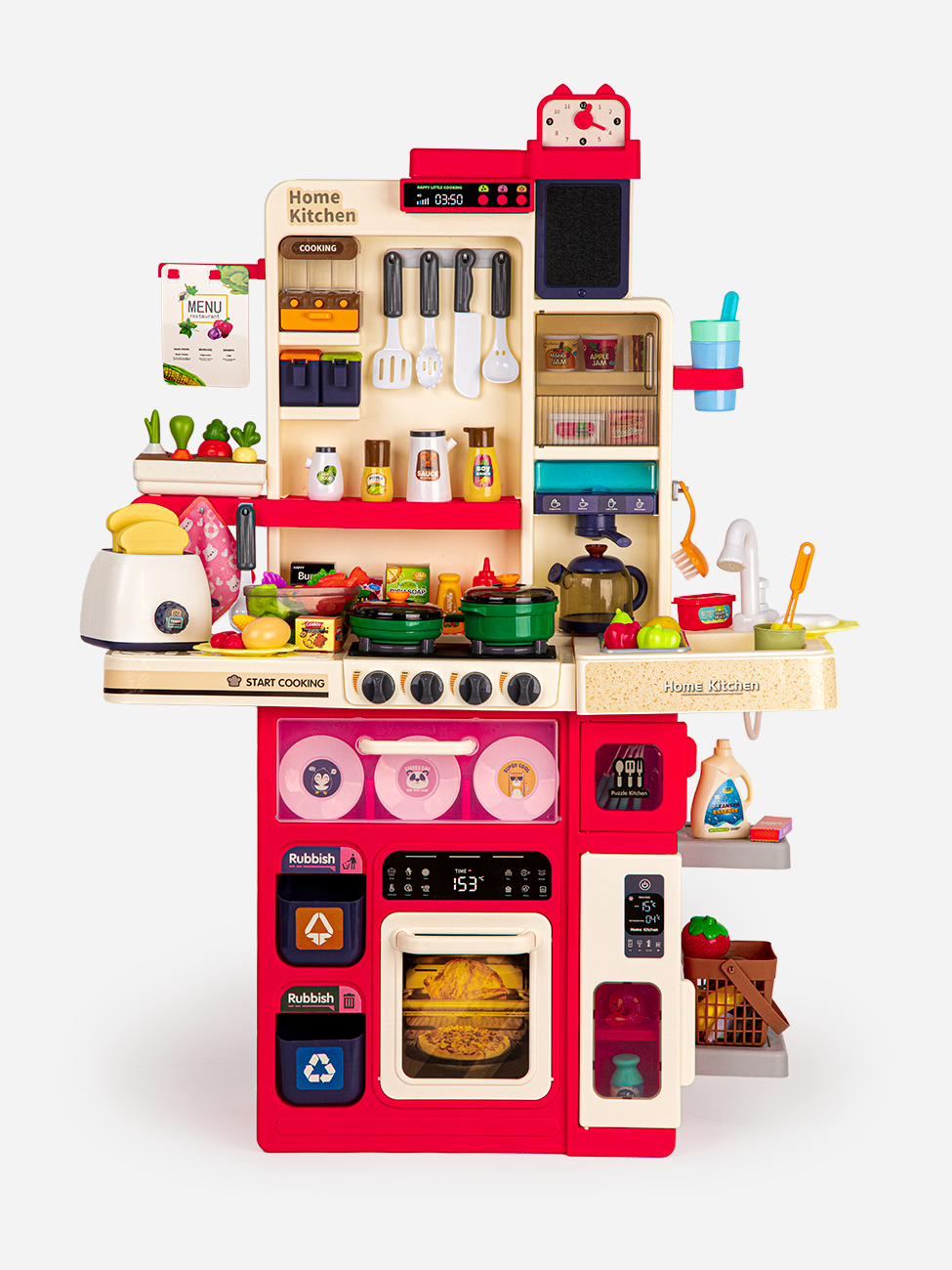 | В комплекте | вытяжка, духовой шкаф, игрушечная еда, кухонная утварь, мультиварка, плита, посуда, раковина, тостер, холодильник, яйцеварка |