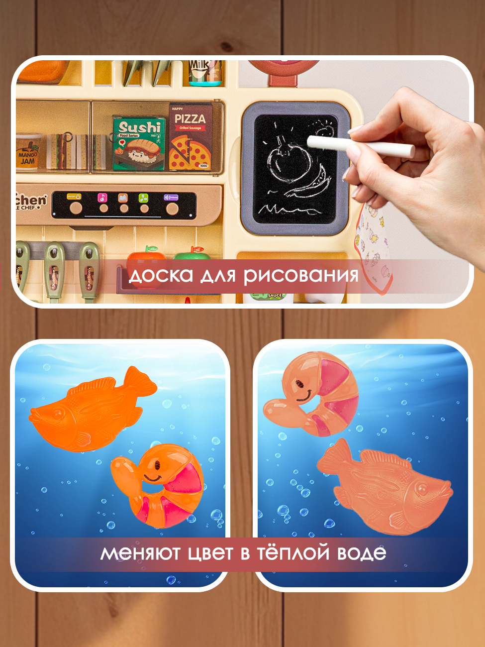 | Комплектация | сковорода / кастрюля / крышка / столовые приборы / тарелки и салатница / чайный сервиз / бутылочки и баночки для специй и приправ. Набор продуктов - конфеты и печенье / яички / готовые блюда (сосиски и яичница) / обычные овощи и фрукты / разрезные продукты. Яйцеварка / разделочная доска / меловая доска / губка и мелки / контейнеры для фруктов и овощей |