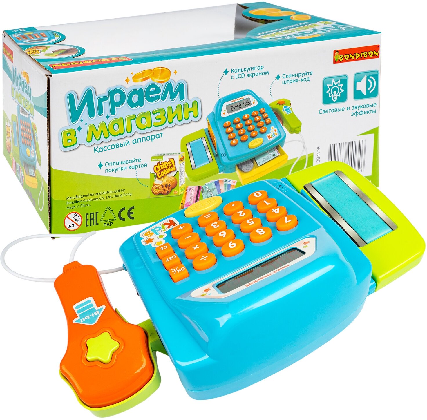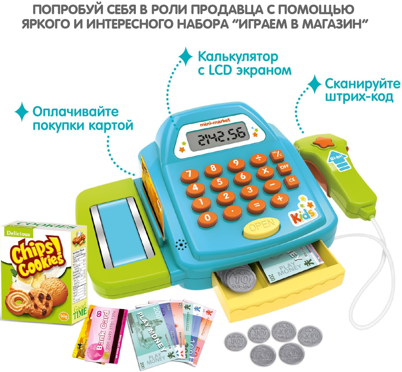 | В комплекте | деньги, калькулятор, кассовый аппарат, сканер, терминал для оплаты картами |