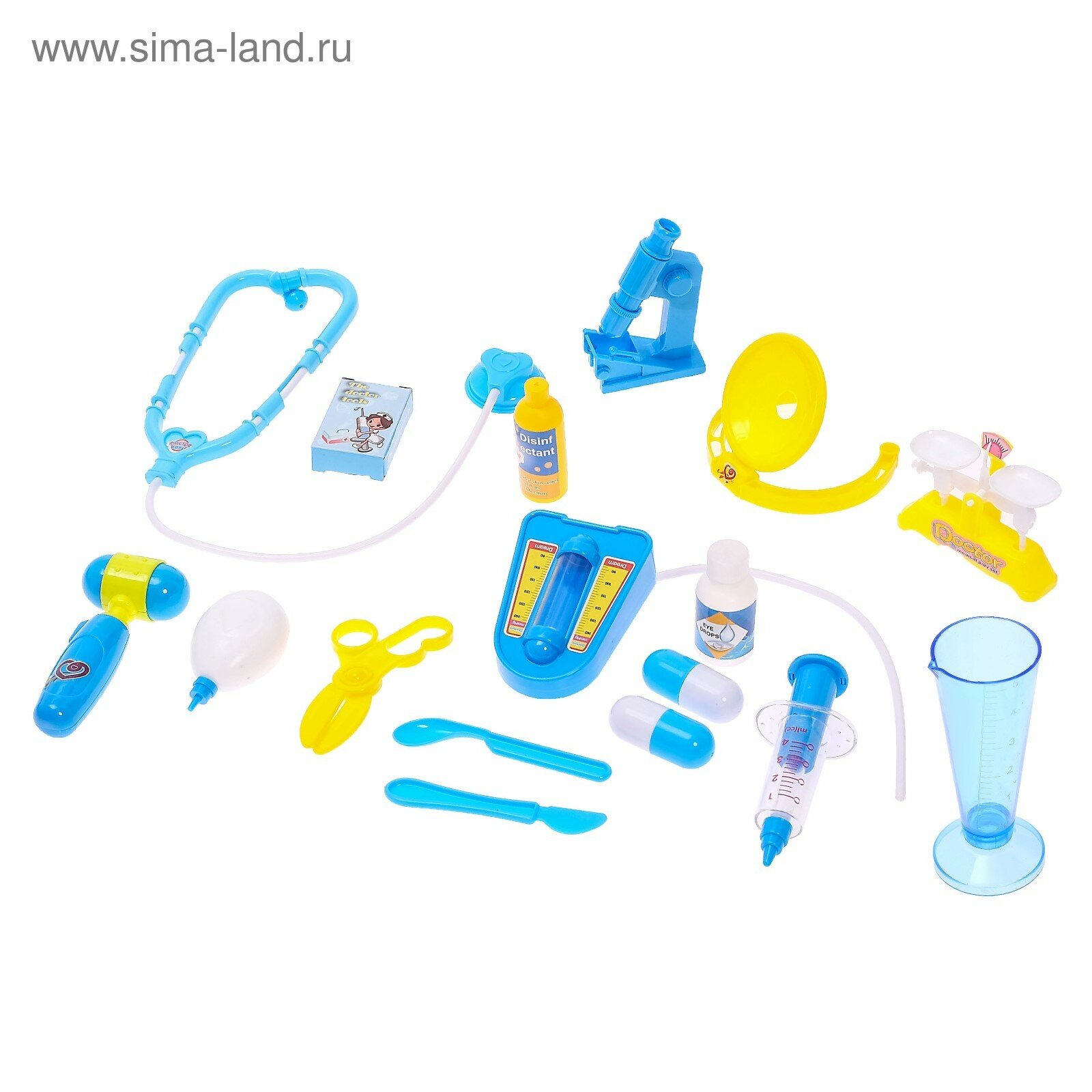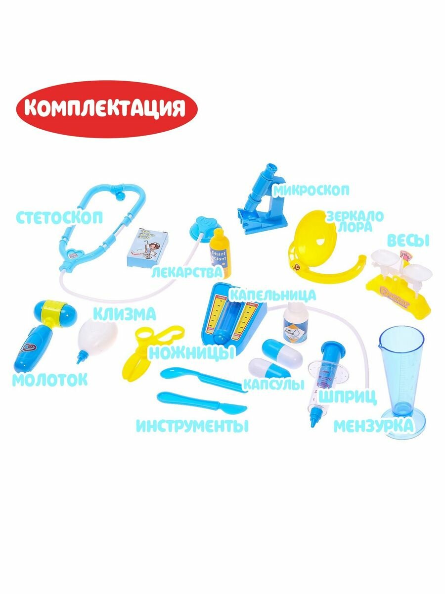 | Комплектация | тележка, 2 бутылочки, коробочка, капельница, 2 пилюли, ложечка, скальпель, молоток, минзурка, ножницы, шприц, стетоскоп, рефлектор лобный, весы, микроскоп, тонометр |