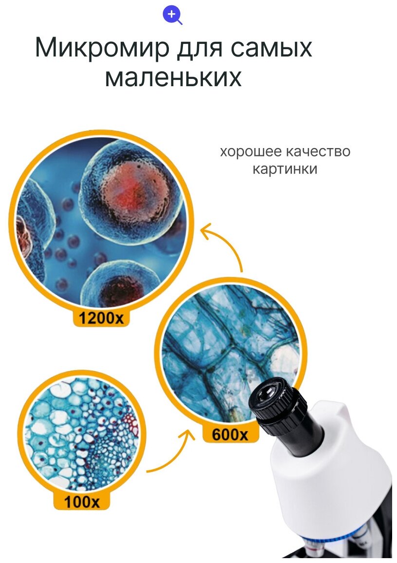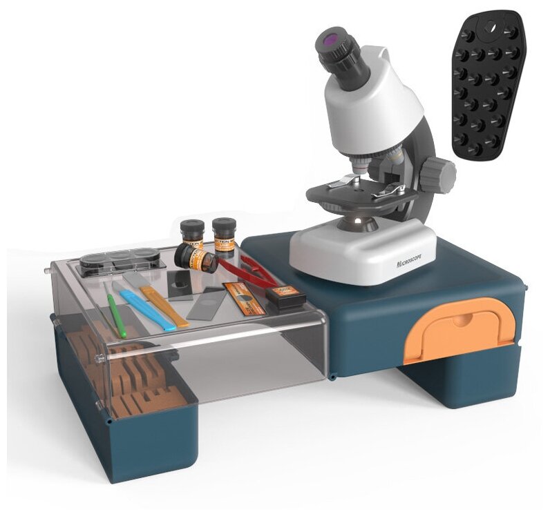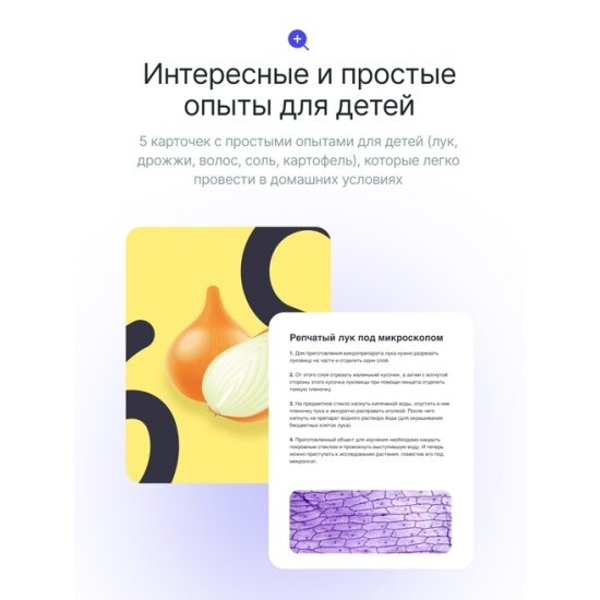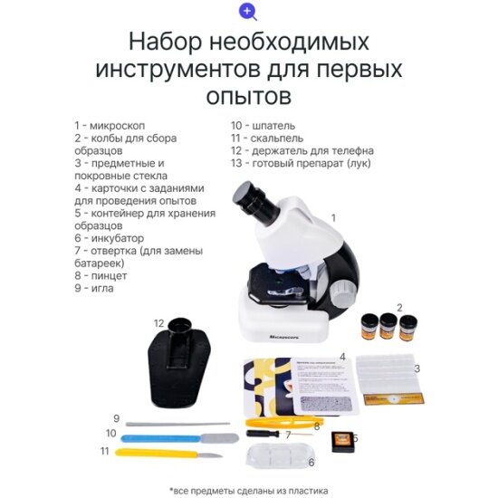 | Комплектация | микроскоп, колбы для сбора, предметные и покровные стекла, карточки с заданиями, контейнер для хранения образцов, инкубатор, отвертка, пинцет, игла, шпатель, скальпель, держатель для телефона, готовый препарат |