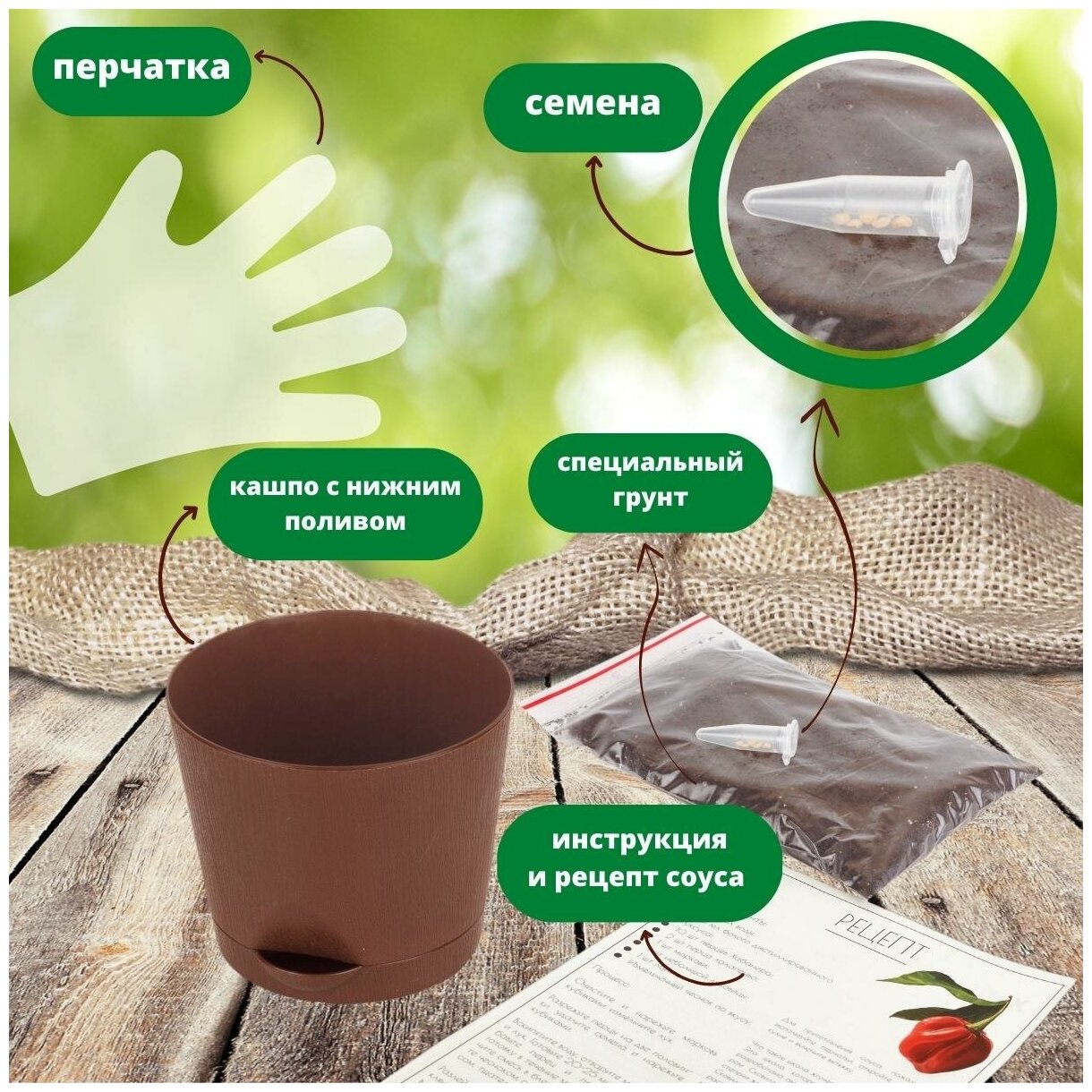 | Комплектация | земля, семена, горшок с системой прикорневого полива, перчатки, инструкция по сорту, рекомендации по посадке, рецепт уникального соуса |