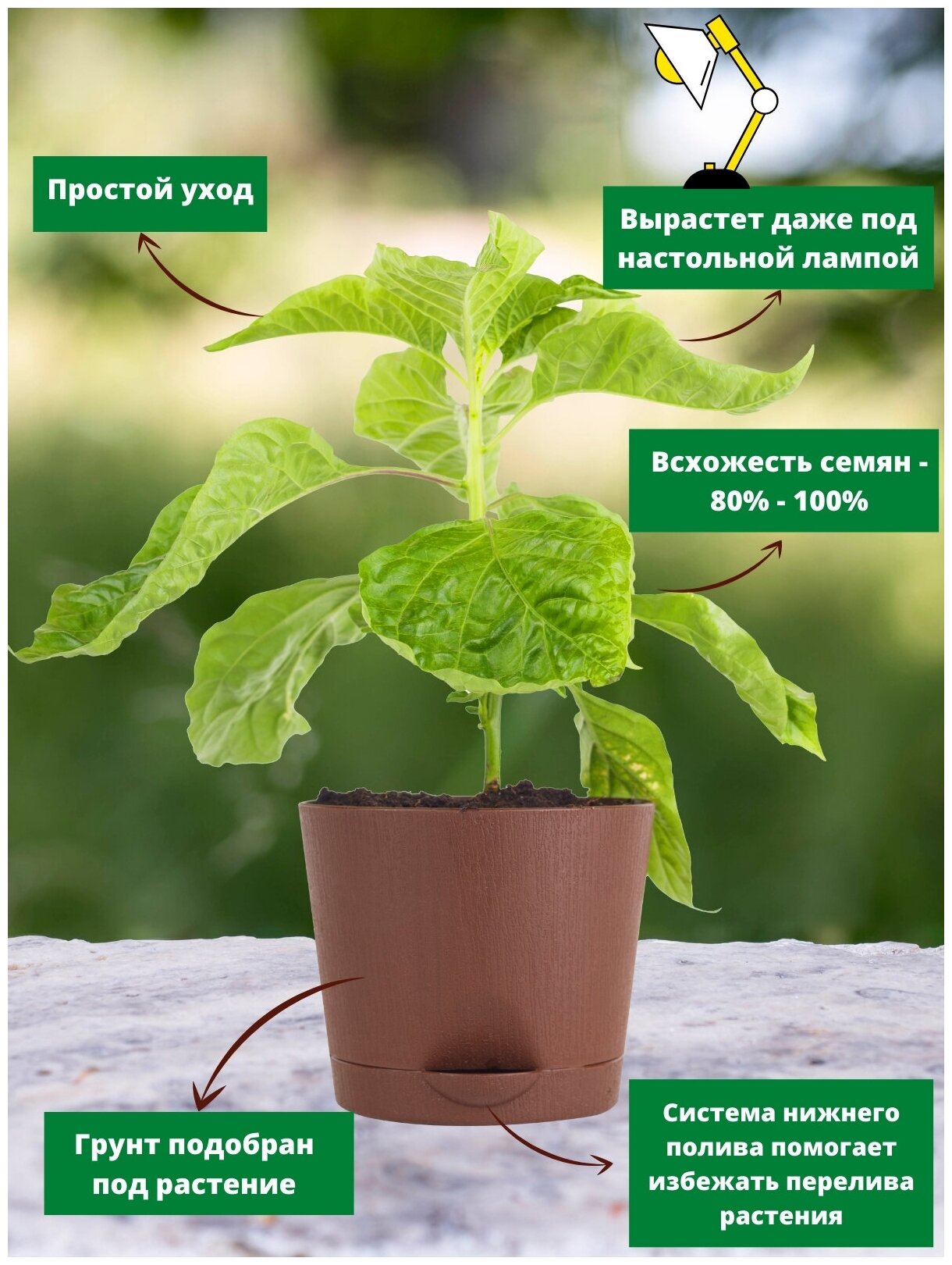 | Комплектация | земля, семена, горшок с системой прикорневого полива, перчатки, инструкция по сорту, рекомендации по посадке, рецепт уникального соуса |