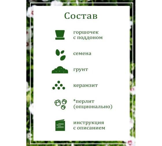 | Комплектация | • Пластиковый горшок объемом 0,5 литра • Крышка-поддон для избытка влаги • Семена • Плодородный грунт (PH=5) • Керамзит для дренажа |
