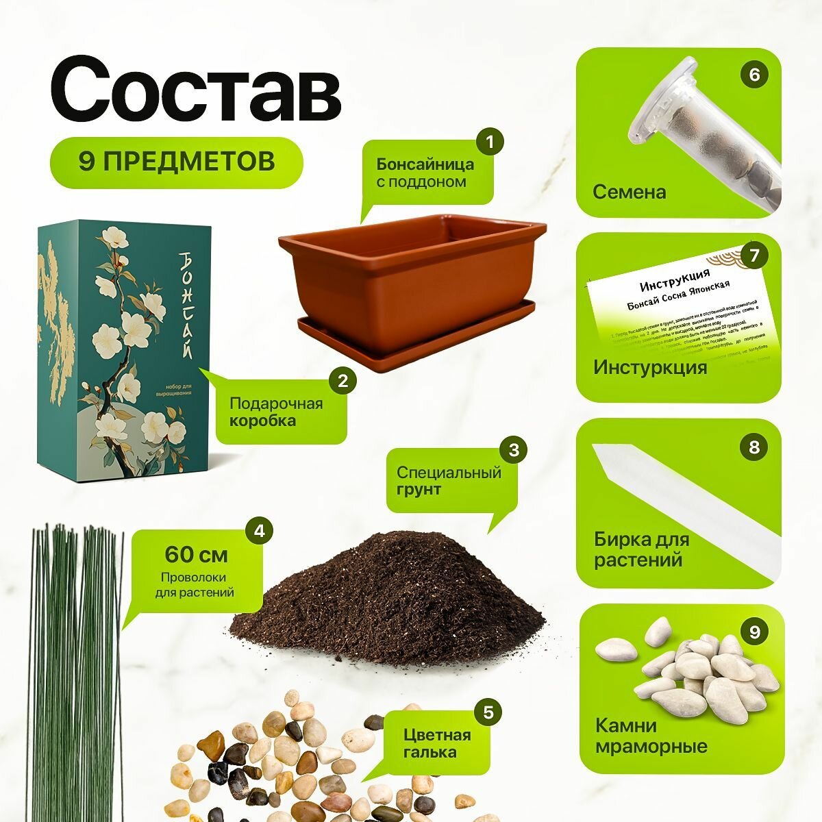 | Комплектация | Семена, грунт, проволока, кашпо, бирка, удобрения, галька, мраморная крошка, инструкция |
