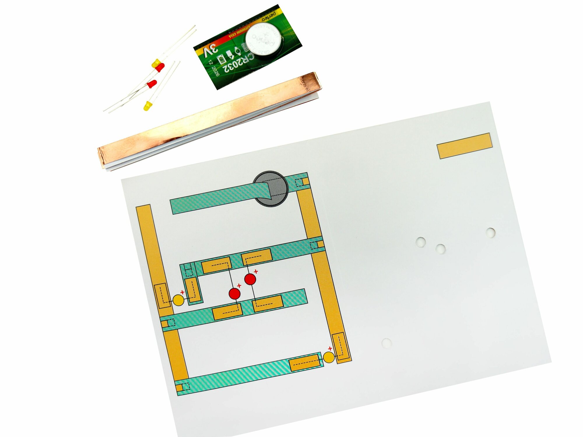 | Комплектация | • картонная открытка – 1 шт. (15 х 21 см) • светодиоды – 4 шт. (2 жёлтого цвета, 2 красного цвета) • токопроводящая медная самоклеящаяся лента (100 х 1 см) • питающий элемент 3V (батарейка CR2032) |