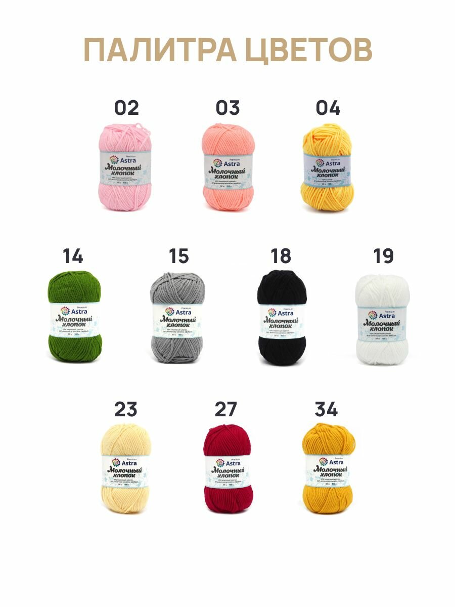 | Комплектация | Упаковка 3 штук Пряжа Astra Premium 'Молочный хлопок' (Milk Cotton) 50гр 100м (+/-5%) (50%хлопок, 50%молочный акрил) (34 горчичный) |