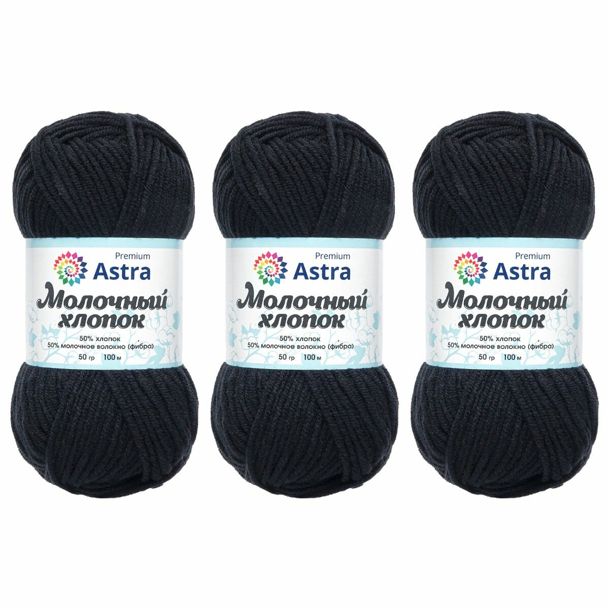 Пряжа Astra Premium "Молочный хлопок", 50 гр 100 м, 50% хлопок, 50% молочный акрил, 18 черный, 3 шт