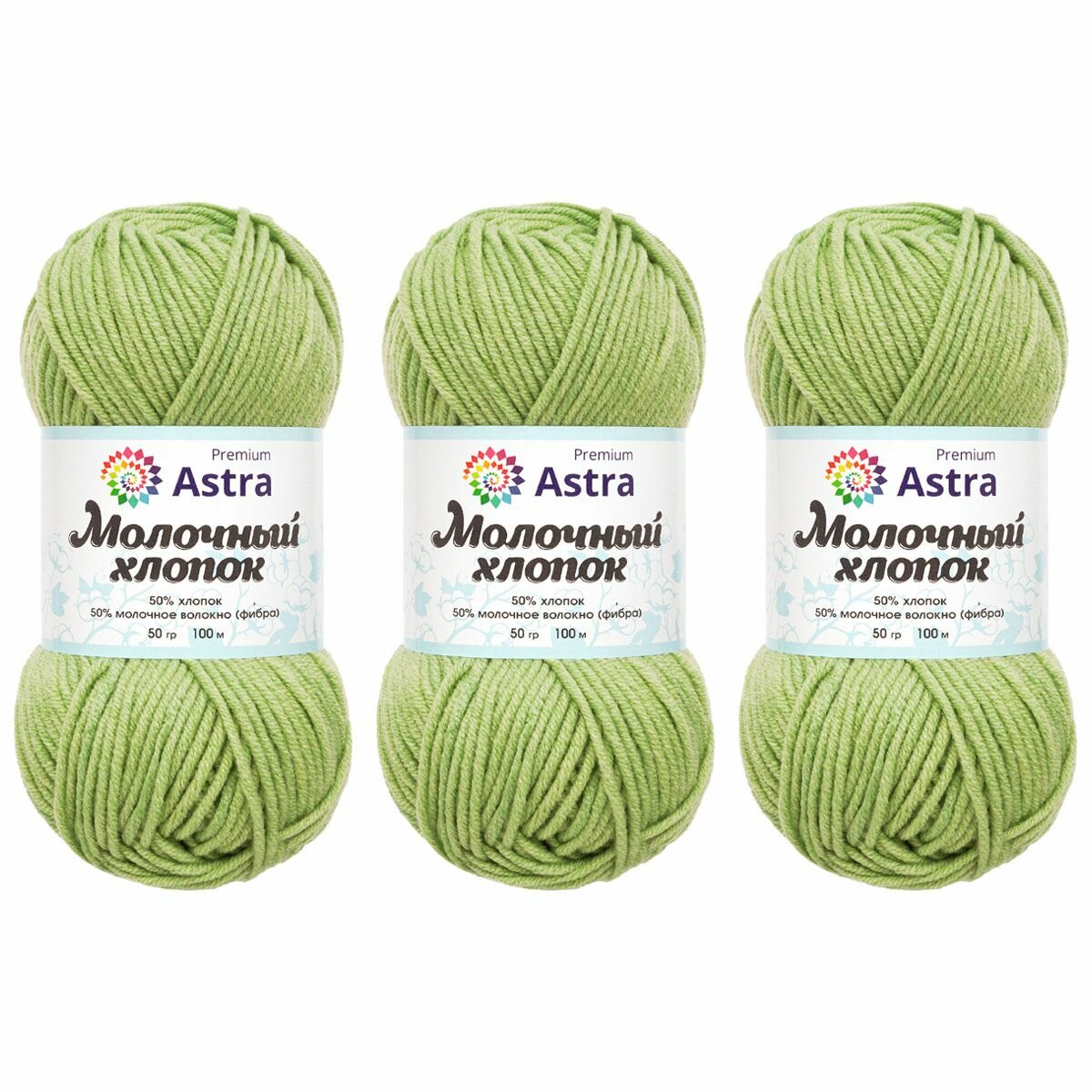Пряжа Astra Premium "Milk Cotton", 50 г, 100 м, 50% хлопок, 50% молочный акрил, цвет 53 Светлый салат, 3 мотка