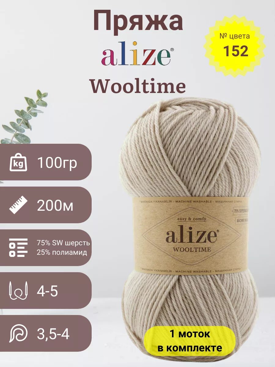 СохранитьПряжа Alize Wooltime Ализе ВулТайм, 152 молочно бежевый, 75% шерсть, 25% полиамид, 100 г, 200 м, 1 моток. интересное: