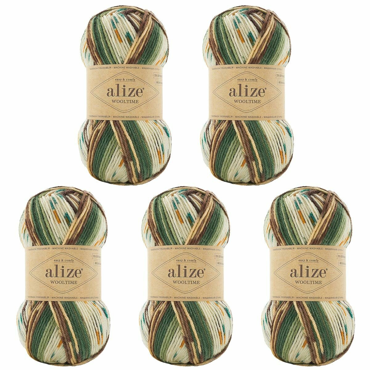 Пряжа Wooltime, Alize, бел/беж/корич - 11023, 75% SW шерсть, 25% полиамид, 5 мотков, 100 г., 200 м.