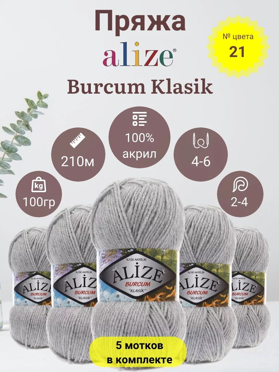 Пряжа для вязания ALIZE 'BURCUM KLASIK' 100гр. 210м (100% Акрил) (21 серый меанж), 5 мотков