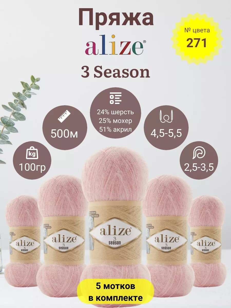 Купить Пряжа Alize 3 Season светло-розовый (271), 25%мохер/24%шерсть/51%акрил, 500м, 100г, 5шт