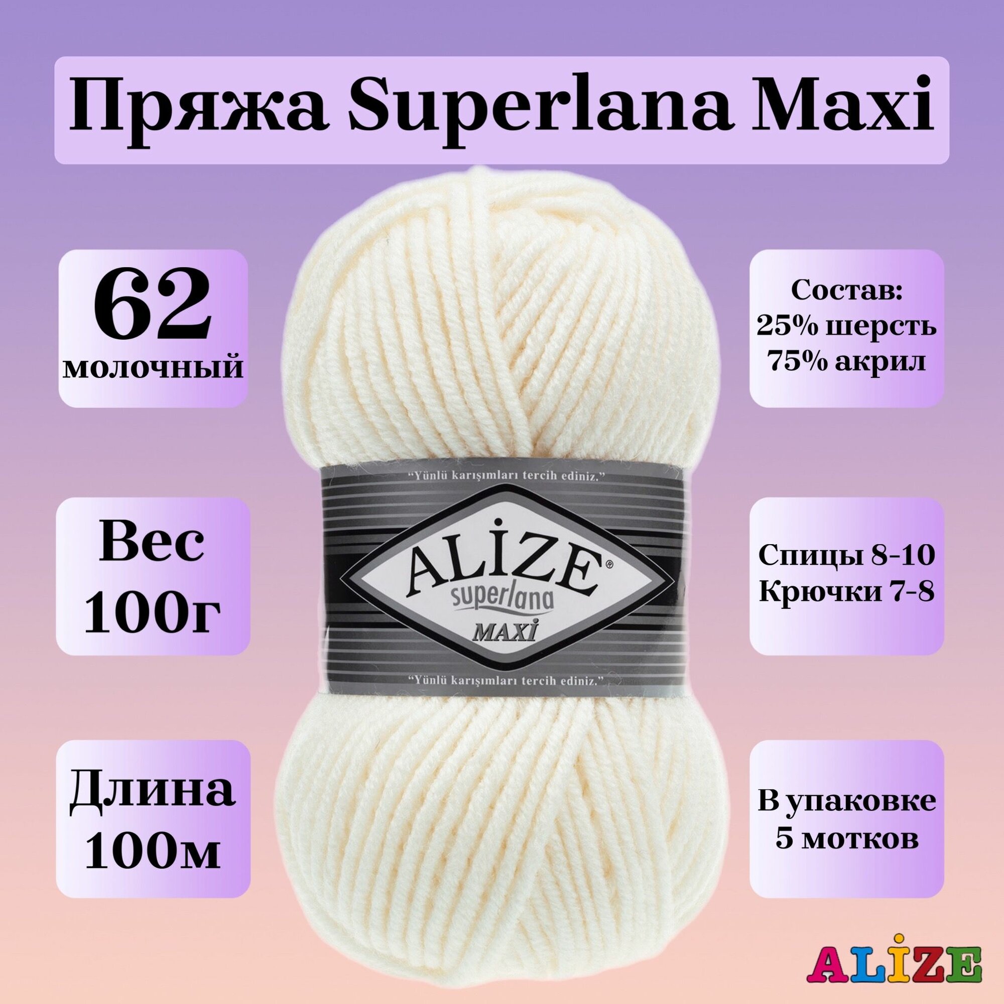 Пряжа ALIZE SUPERLANA MAXI, молочный - 62, 25% шерсть, 75% акрил, 5 мотков, 100 г, 100 м.