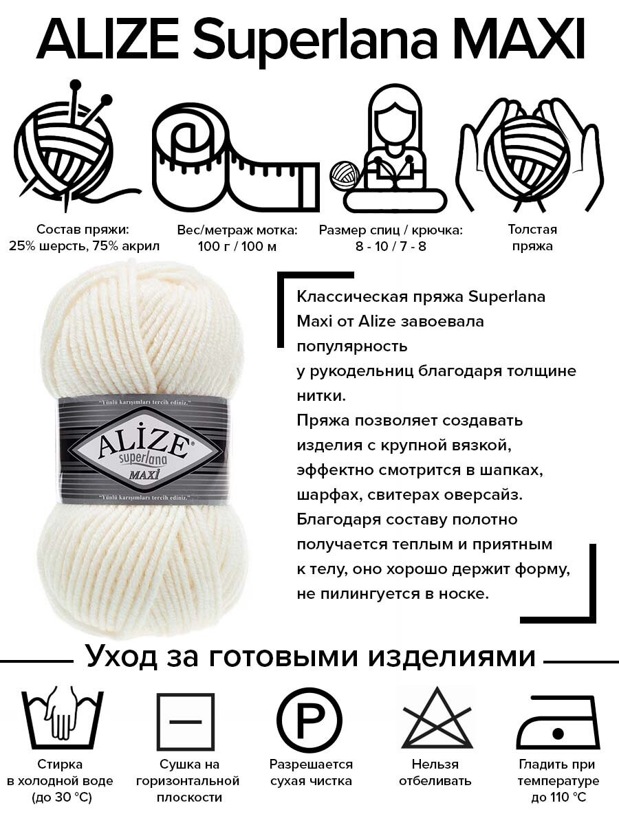 СохранитьПряжа для вязания Alize Superlana Maxi, цвет 62 молочный, 100г, 100м, 5шт/упак интересное: