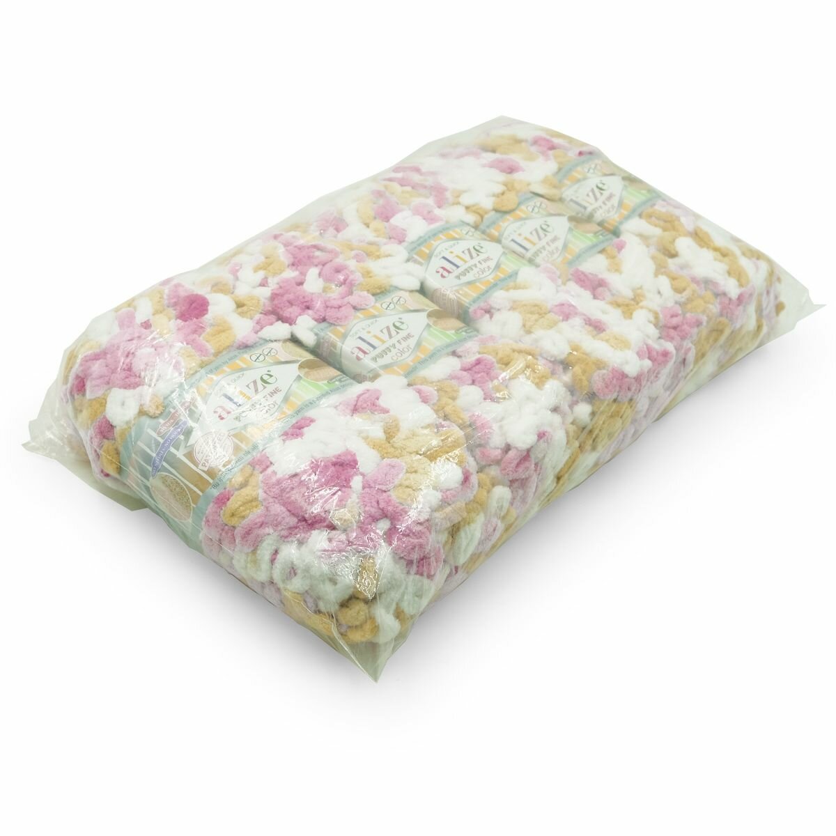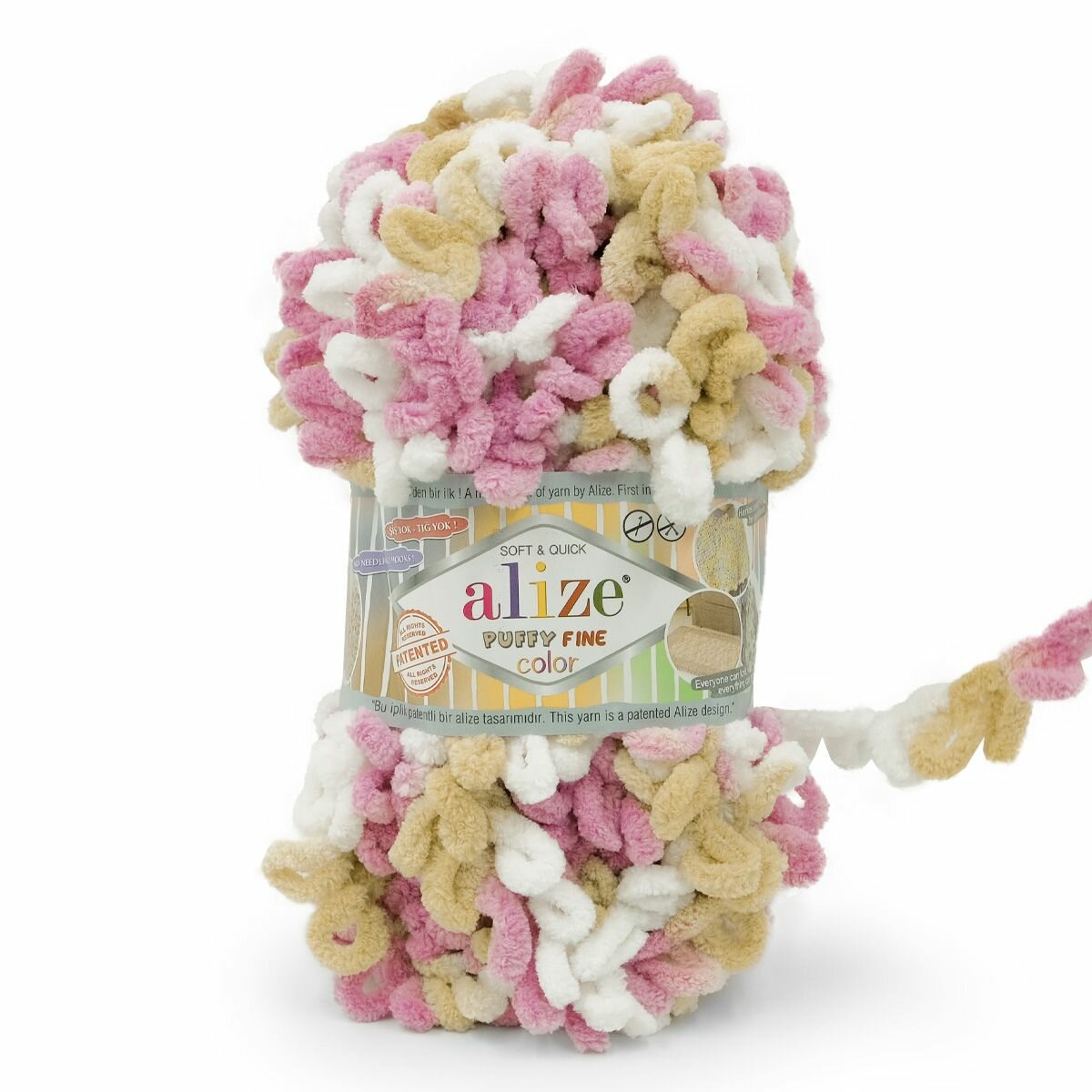 Пряжа PUFFY FINE COLOR (Alize), бел/бирюз/яр. розов - 6377, 100% микрополиэстер, 5 мотков, 100 г, 14 м.